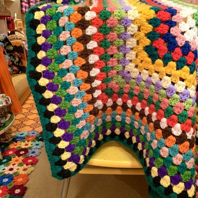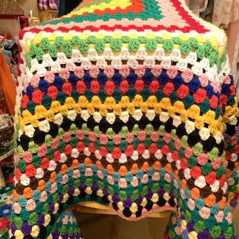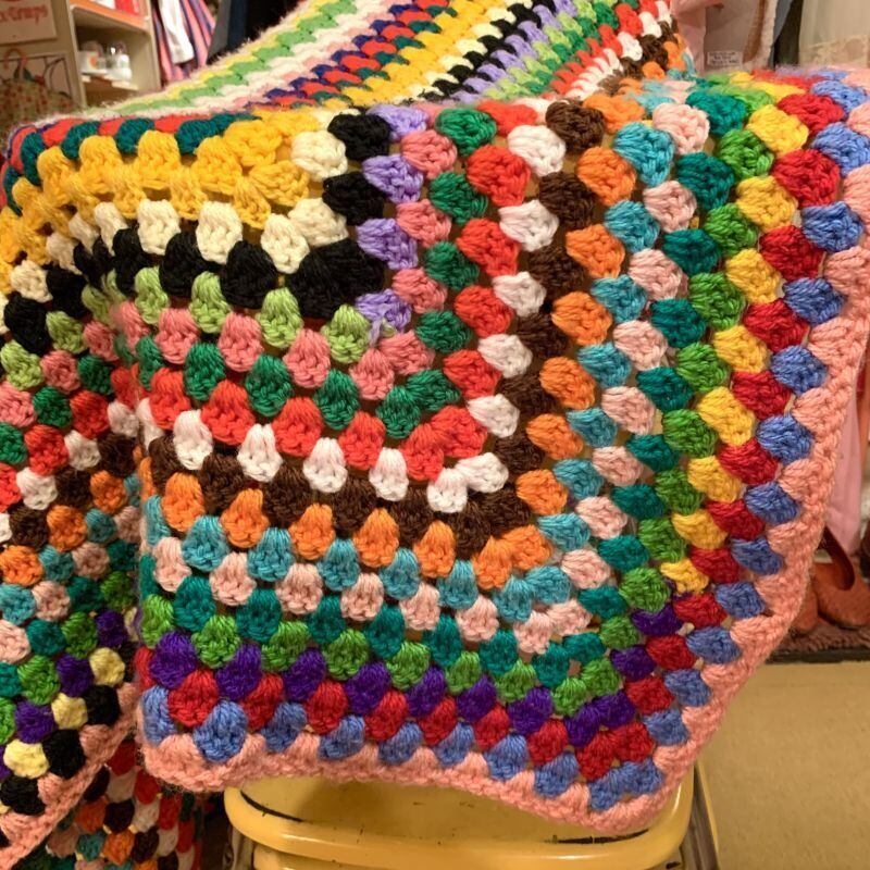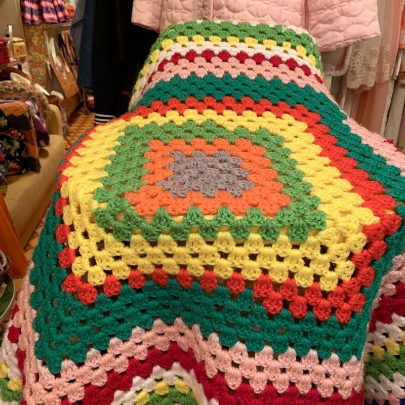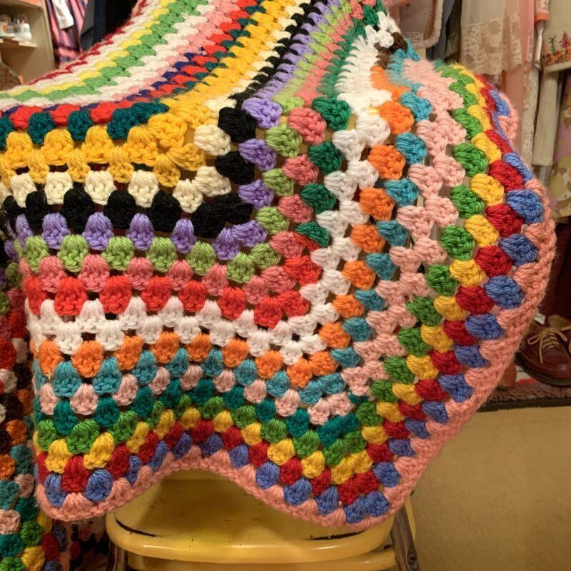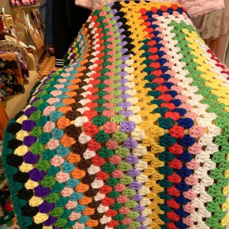 オレンジ、ピンク、ホワイト、イエロー、ブルー、グリーン、レッド、ブラックなどカラフルな色使いと雫型のような編み目がとっても可愛いブランケットです。