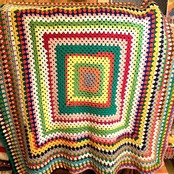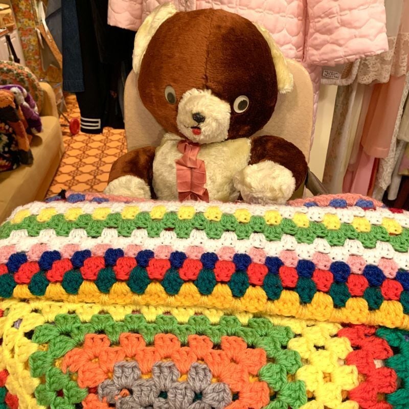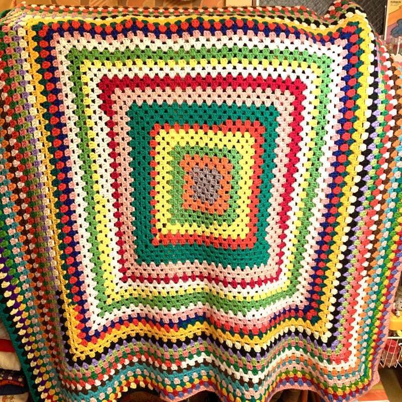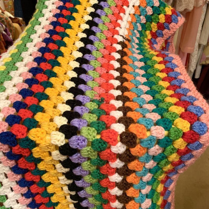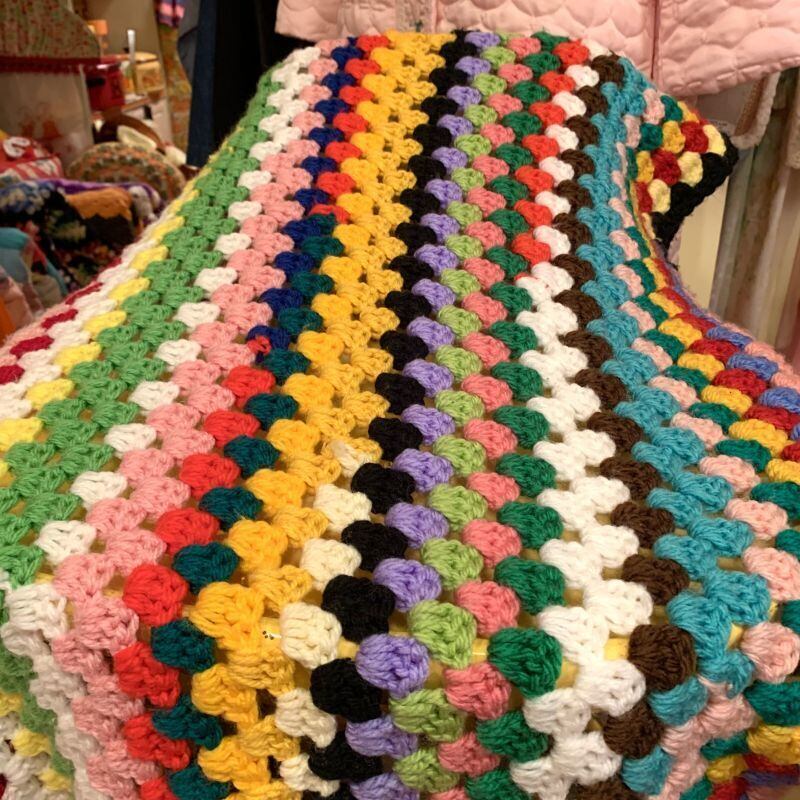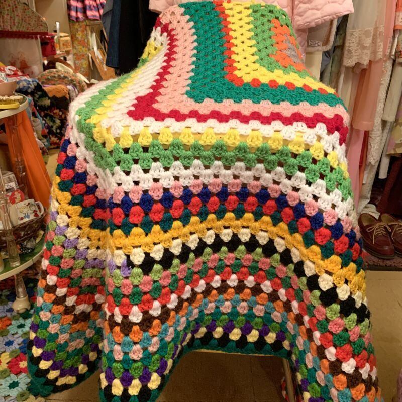 オレンジ、ピンク、ホワイト、イエロー、ブルー、グリーン、レッド、ブラックなどカラフルな色使いと雫型のような編み目がとっても可愛いブランケットです。