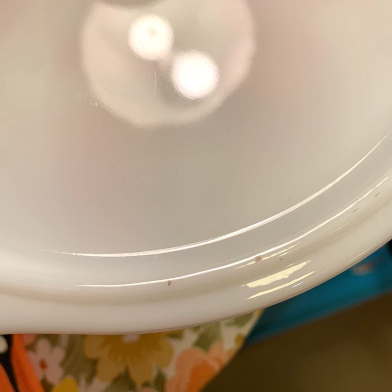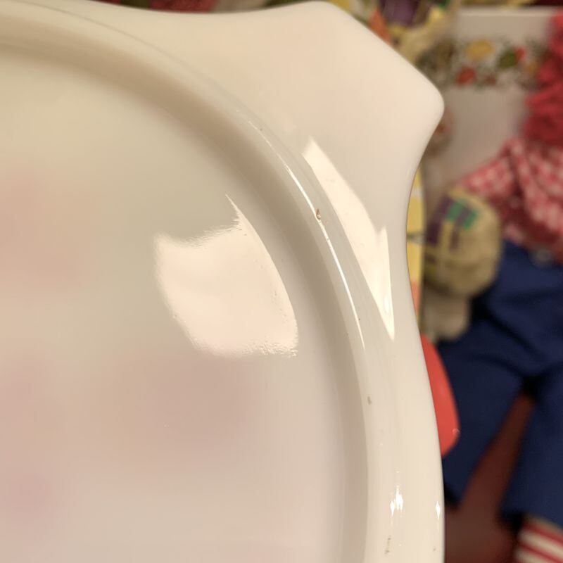製造時からと思われる僅かな色むら、蓋の淵近くにごく薄らとした線のようなシミ、内側に点のような気泡が数ヶ所、底面の表側に点のようなシミが数ヶ所見られますが、欠けなど大きなダメージは無く、つやもあり全体的にGood Conditionかと思います。