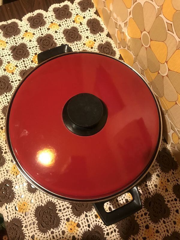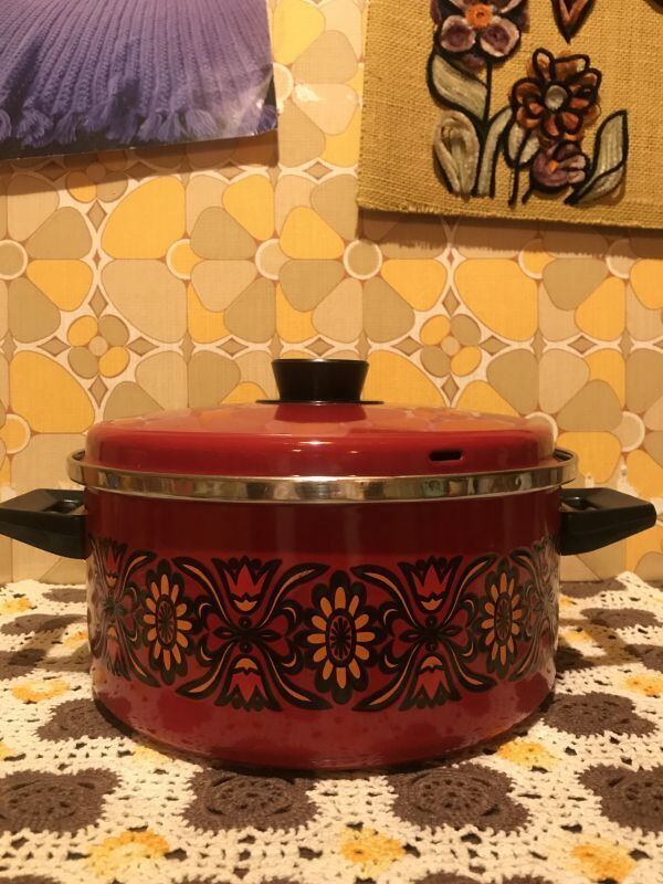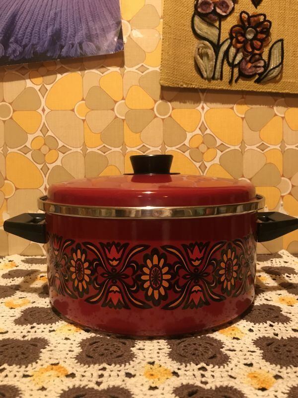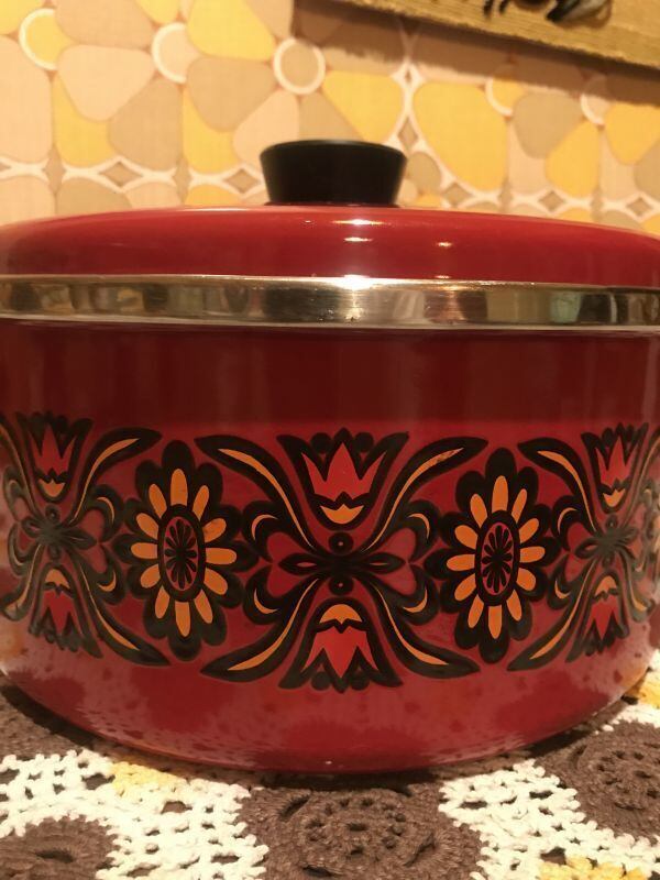 70'S USA ボルドーレッド・VINTAGE FLOWER柄 両手鍋です。ボルドーがかったレッドカラーにブラックの持ち手や取っ手、ヴィンテージならではのレトロなFLOWER柄がとっても可愛いです。大きめなサイズなのでカレーやシチュー、スープなど煮込み料理に扱い易いサイズかと思います。食卓に鍋のままだしても素敵な雰囲気になると思います。なかなか出会えないデザインの鍋かと思います。見とれてしまう程レトロで可愛いデザインです。蓋や内側、表側の底面に若干の擦れ、表側のふち周りに若干の錆び、持ち手など若干の経年感が見られますがご使用に支障は無いかと思います。