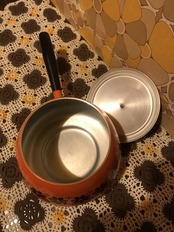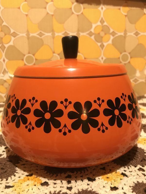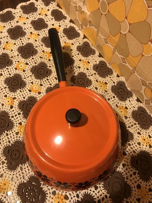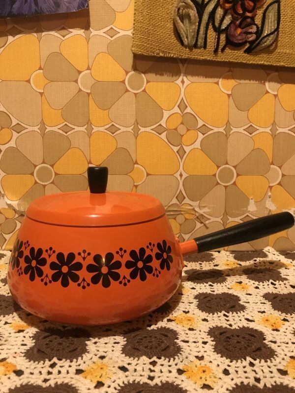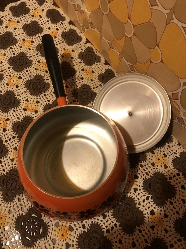 70'S USA OR/BK FLOWERライン 片手鍋です。ブラックとオレンジのカラーリングやレトロなFLOWERライン模様がとっても可愛いです。WOOD製の持ち手のフォルムや全体のフォルムもとっても可愛いですね。表側の底面に黒いシミ、内側に擦れが見られますがご使用に支障は無いかと思います。小ぶりなサイズ感も可愛いです。