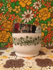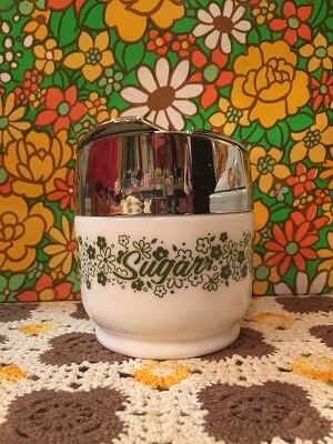 70'S USA コーニング社 Gemco スプリングブロッサムSUGAR POTです。ぽってりとしたフォルムのミルクガラスにレトロなグリーンのスプリングブロッサム柄やSugarのフォントがとっても可愛いです。プラスチックにシルバーのメッキを施した蓋もデザインが素敵ですね。蓋の端にシュガースプーンを入れる箇所があります。ごく僅かなペイントロス、蓋に擦れやキズが見られますがヴィンテージならではの素敵な雰囲気です。
