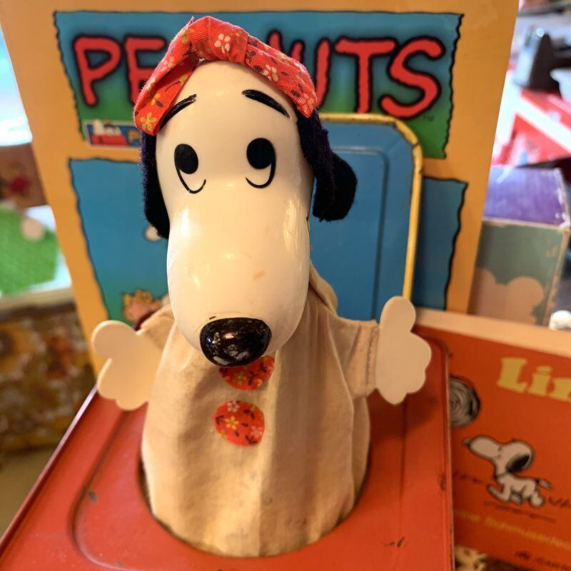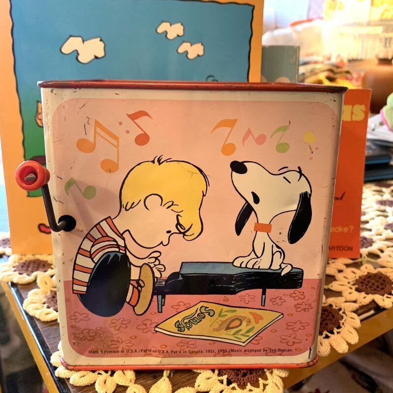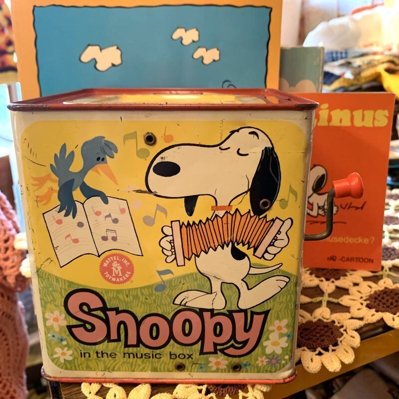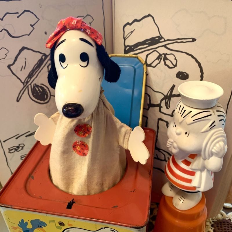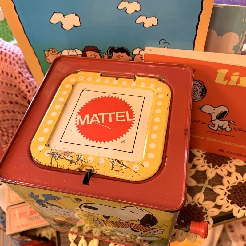60年代 ヴィンテージ Mattel社 スヌーピーのブリキ製ミュージックボックストイ(びっくり箱)です。
