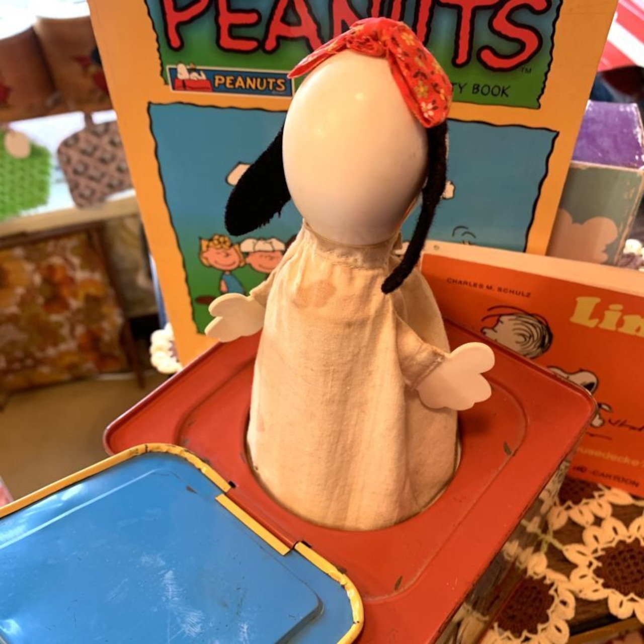 本来は右横のハンドルを回しますと音が鳴りスヌーピーが飛び出す作りなのですが、音は鳴らない状態です。