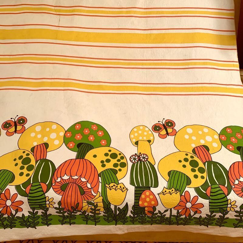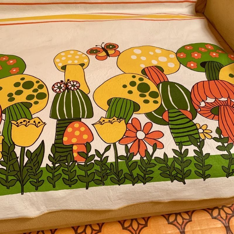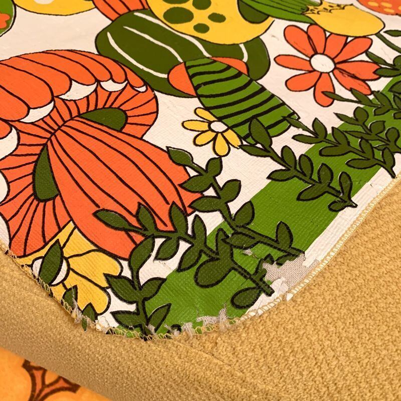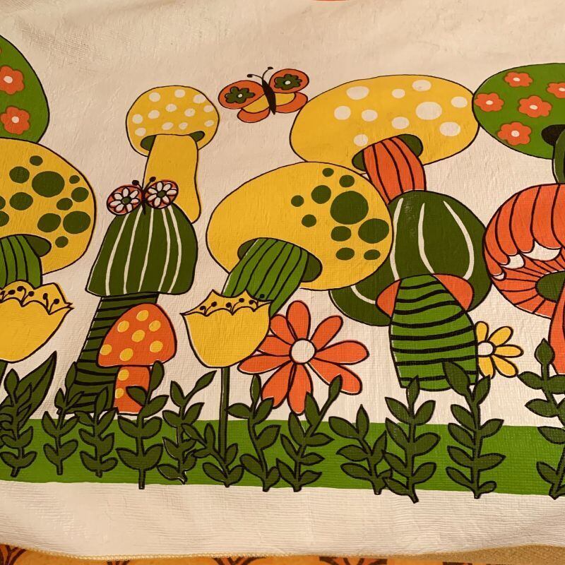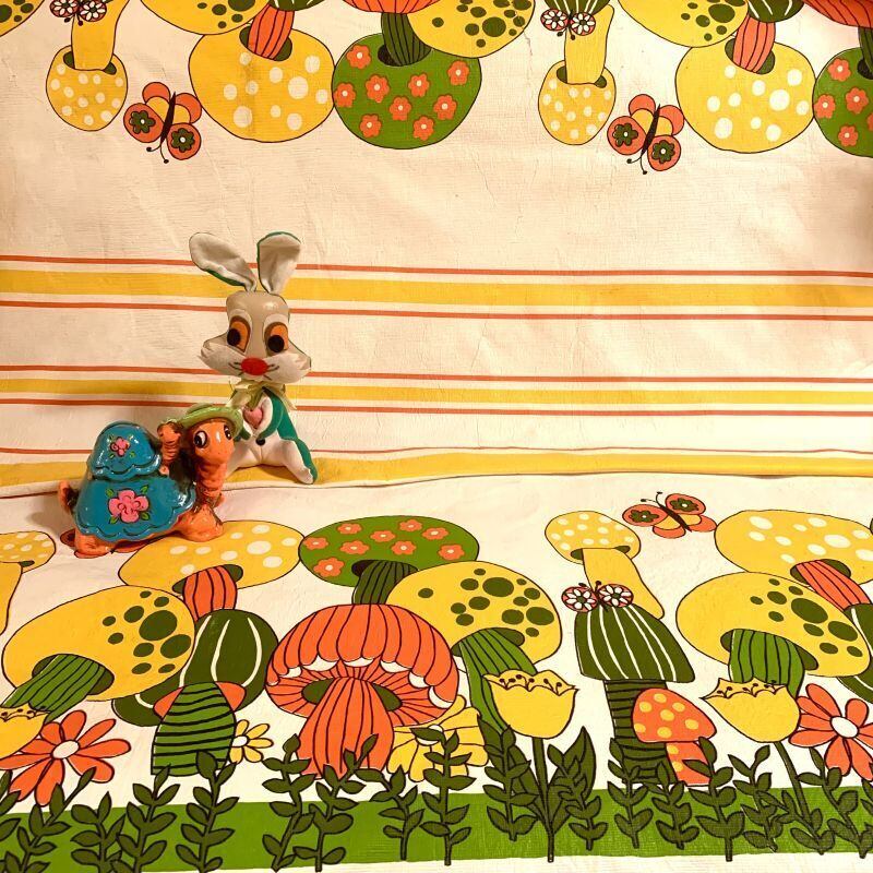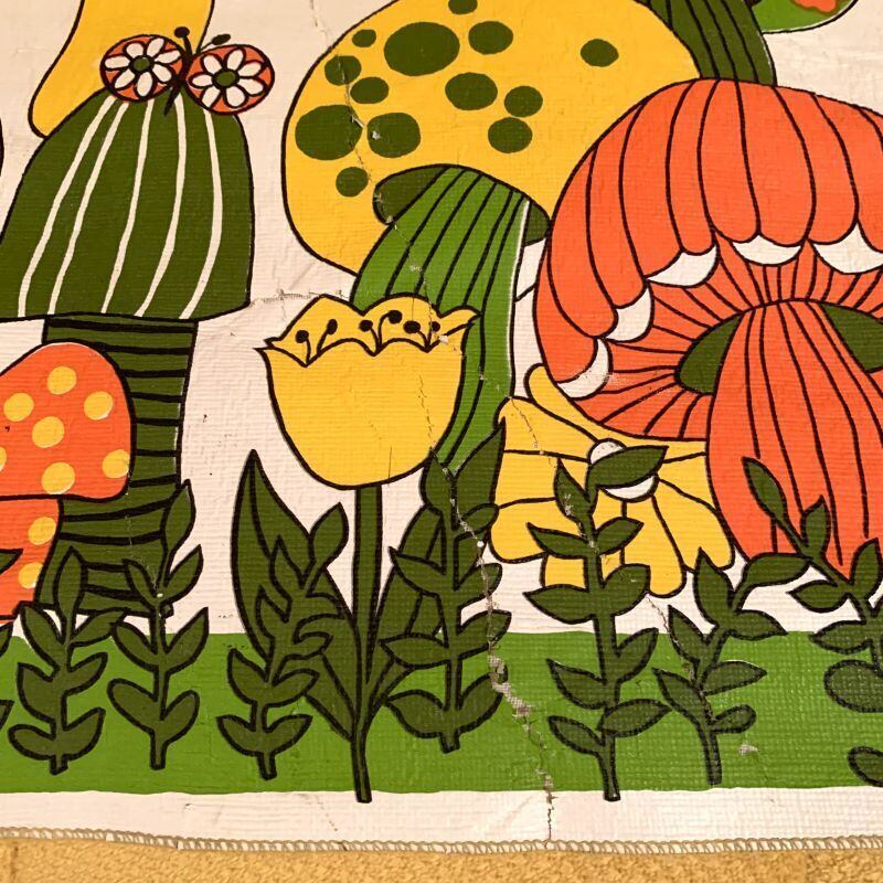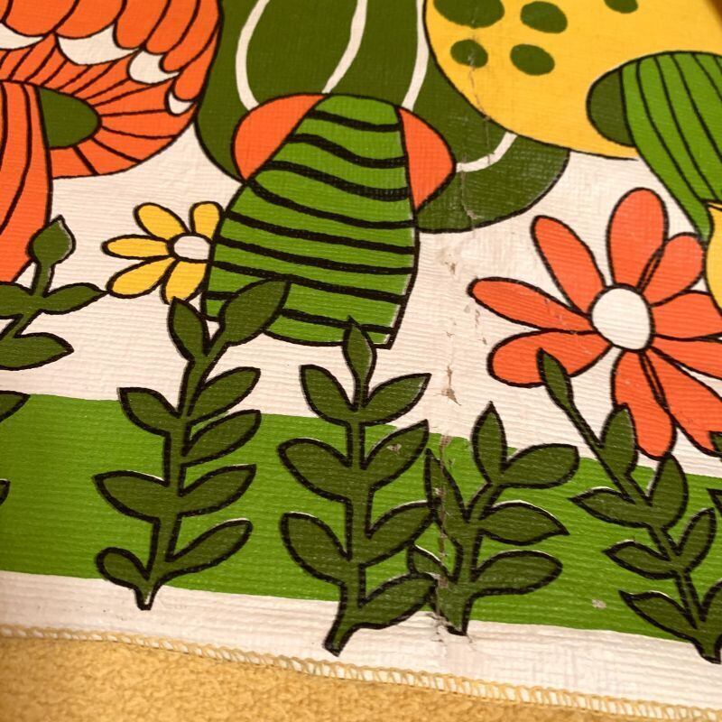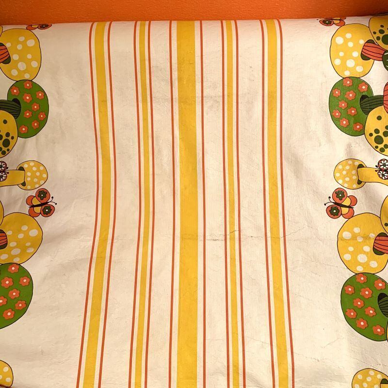 70年代 キノコやフラワー、バタフライのハッピーな絵柄が可愛いビニールクロスです。