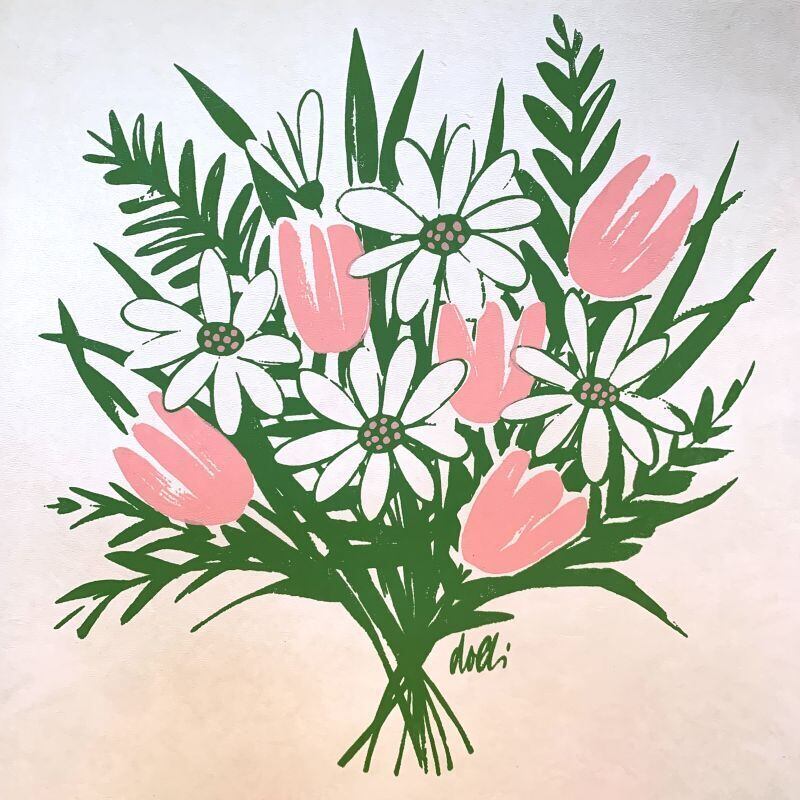 ホワイトカラーのレザーにピンクのチューリップとピンクドットのデイジーの花束のペイントがとっても可愛いです。