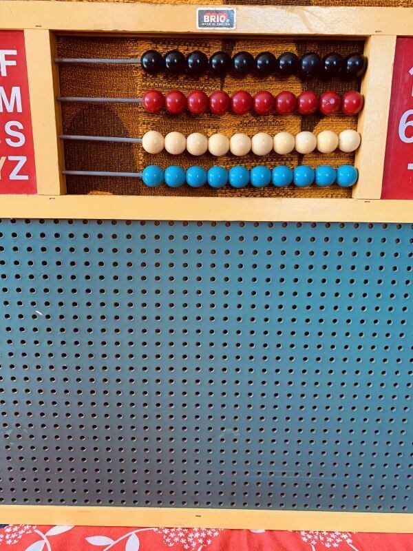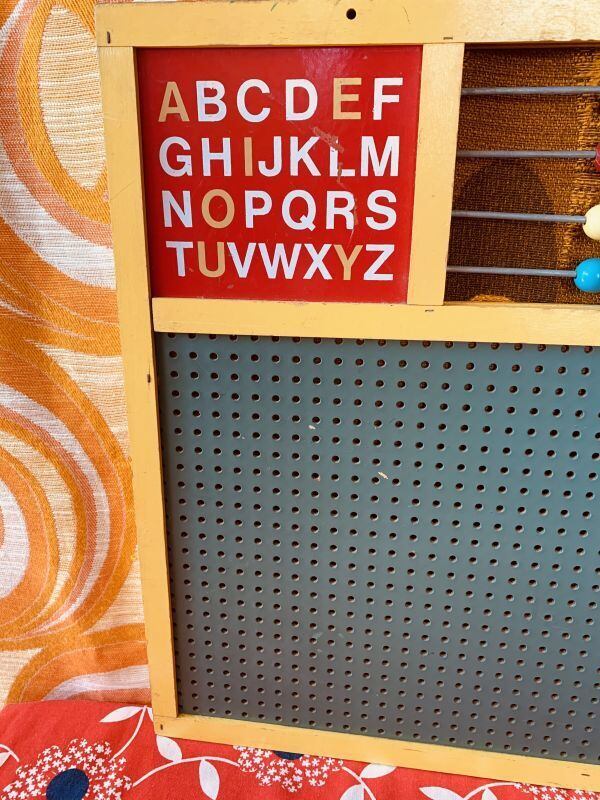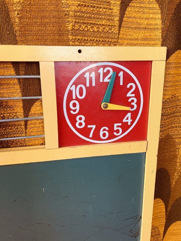1940年代 SWEDENの老舗玩具メーカーBRIO社のカラフルAbacus ball Blackboard Vintage Toyです。WOOD製のフレームにはイエローのペイントが施されており、時計やアルファベット、数字、4色のカラフルなAbacus ball があります。片面は黒板、もう片面はパンチングボードになっています。実際にお子様の玩具として、店舗やお部屋のディスプレイとして、温かみのあるアンティークな雰囲気がお楽しみ頂けるかと思います。古い商品の為、経年によるシミやキズ、黒板のペン跡、パンチングボードやフレームの小さな剥がれなど見られますが、年代の割にはきれいな状態かと思います。置くだけでとても雰囲気のあろヴィンテージTOYです。