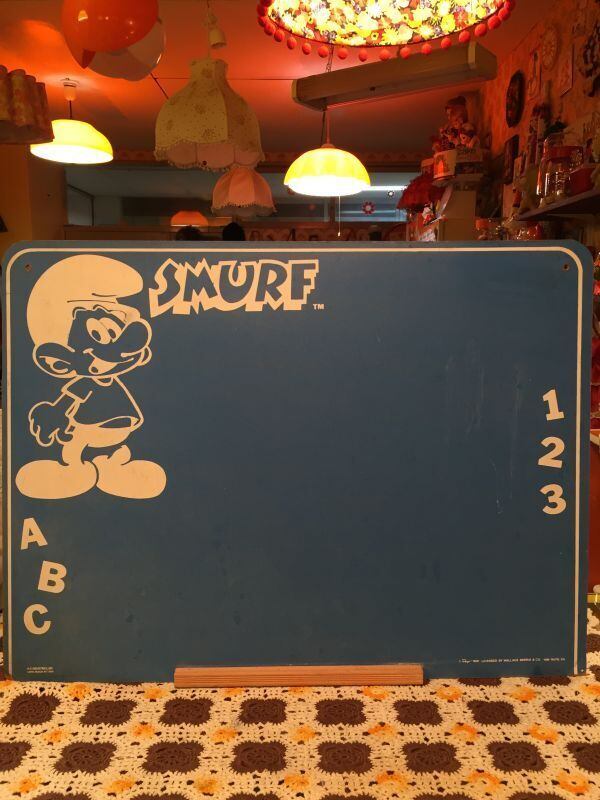 ブルーのボードにホワイトカラーのスマーフやアルファベット、数字のプリントがレトロで楽しい雰囲気です。