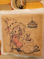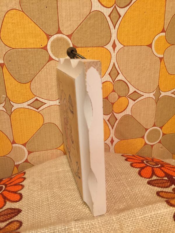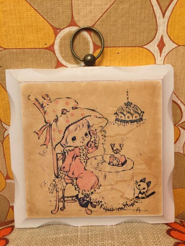 70'S USA DEADTOCK 未使用の壁掛けです。水玉ボンネットをかぶって、もしもしお電話をする女の子や見上げているネコさんの絵柄がとっても可愛いですね。WOOD素材にホワイトペイントされたなみなみカットラインのフレームも可愛いですね。金具のフォルムもアンティークな雰囲気で素敵です。経年によるペイントの擦れ、絵柄にシミ、色褪せがありますが時を経た素敵な雰囲気があります。
