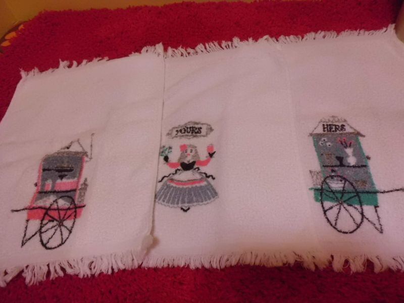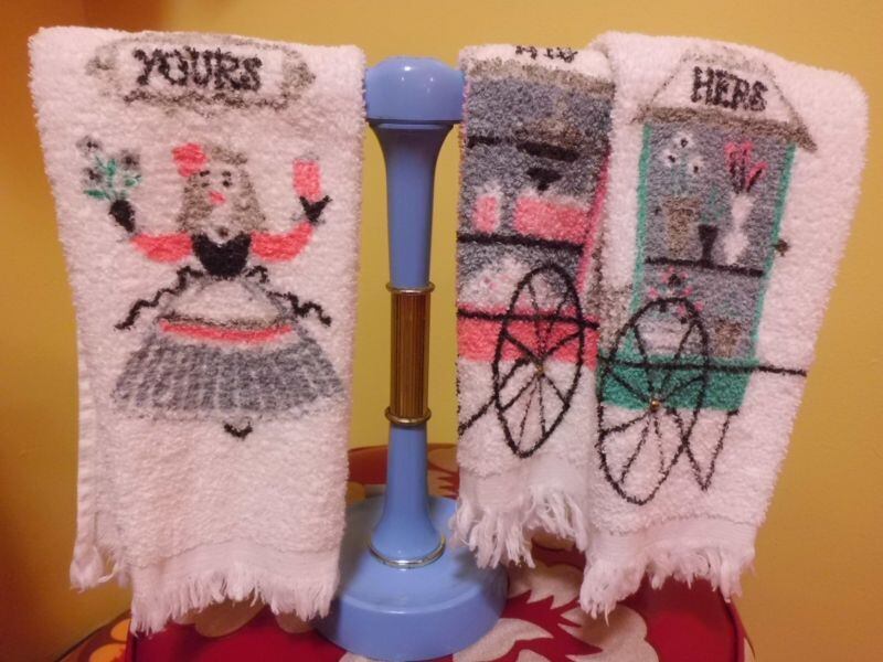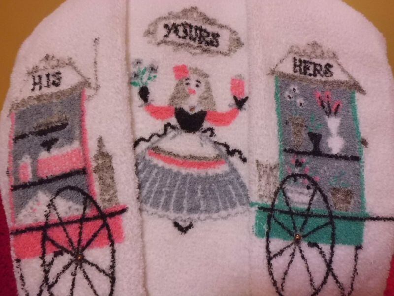3枚のタオルにはそれぞれHERS,YOURS,HISの文字がプリントされていて、絵柄もとっても可愛いです。車輪の柄の真ん中に小さな金のビーズが、女の子の柄にはネックレスのところにダイヤをイメージしたビーズがついています。ハンガーはヴィンテージの雰囲気がとても素敵です。擦れなどの若干の経年感、ハンガーの中央の棒とタオルを掛けるバーの部分が外れてしまい接着剤にて補強しております。裏にLONDON WARE INCと刻印がありますがアメリカ買付けの商品となります。