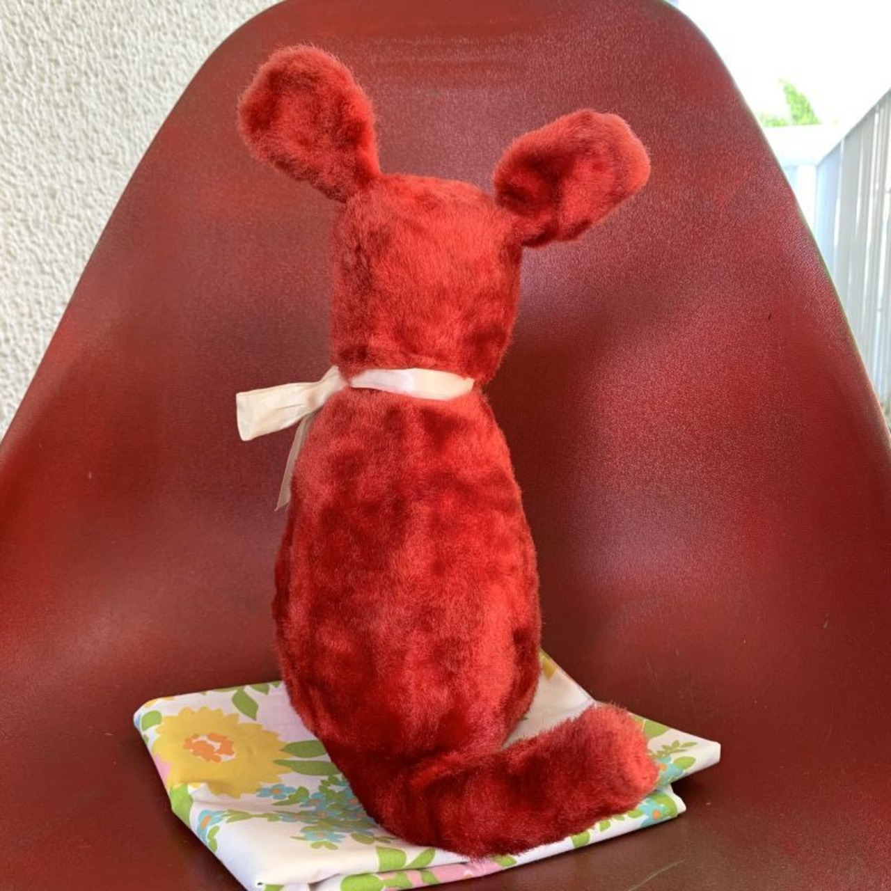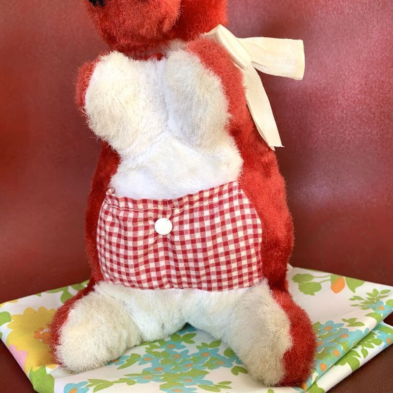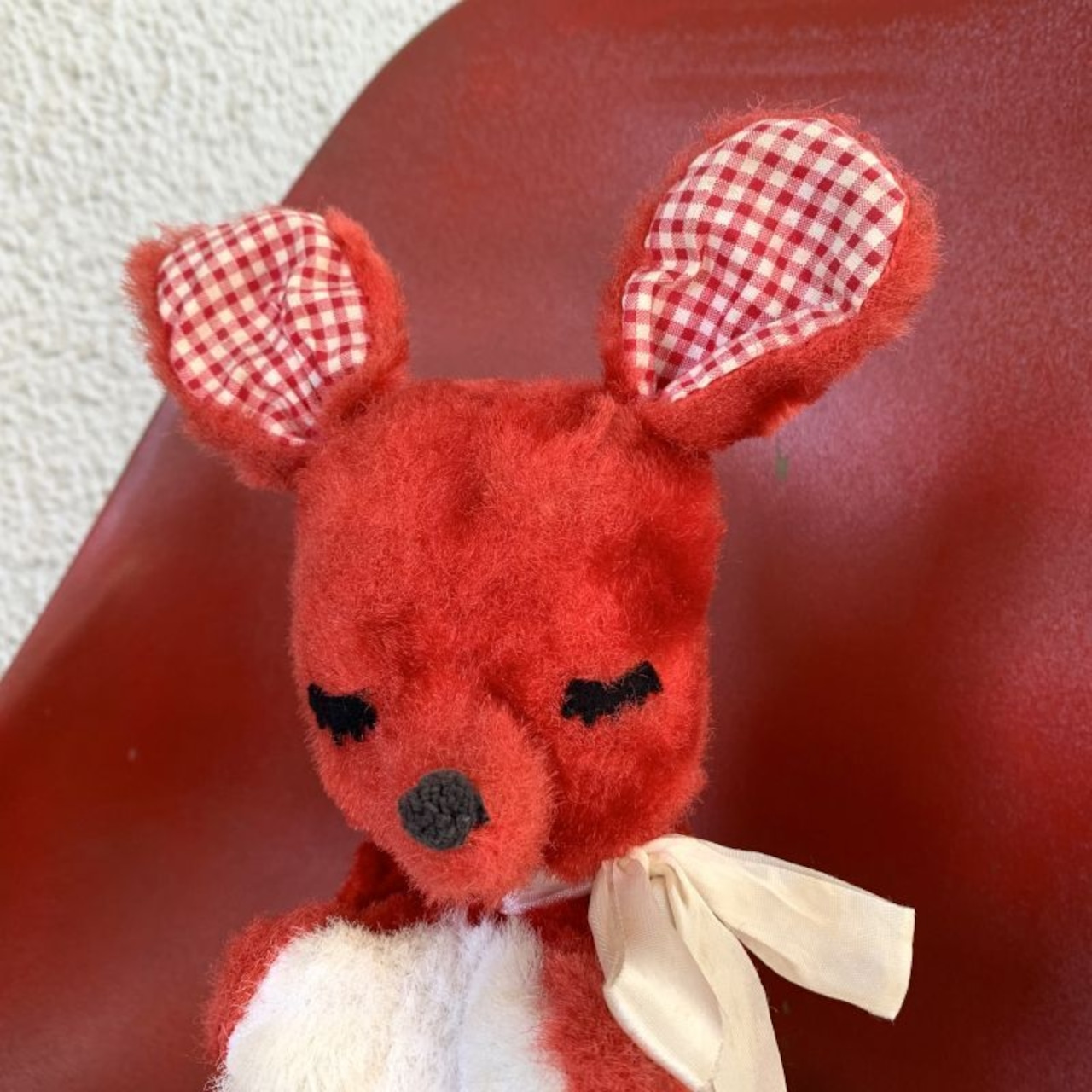 レッド、ホワイトのカラーリングにギンガムチェックのお腹のポケットや耳、首元のサテンリボン、うっとりおすましな表情がとっても可愛いアイテムです。