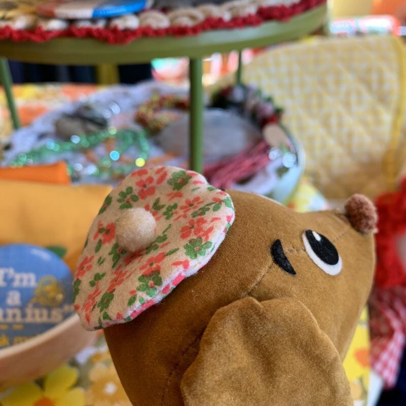 キャメルブラウンの別珍素材のボディーに蛍光ピンク、ライトグリーンのポップなフラワー柄のベレー帽スタイルがとっても可愛いアイテムです。