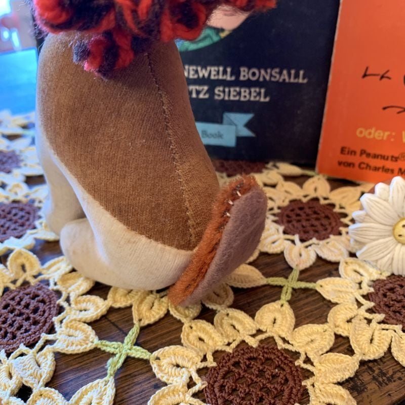 本来は首元に樽が付いているのですが、欠損しており、ブラウンとレッドのニットマフラーを後付けで付けております。