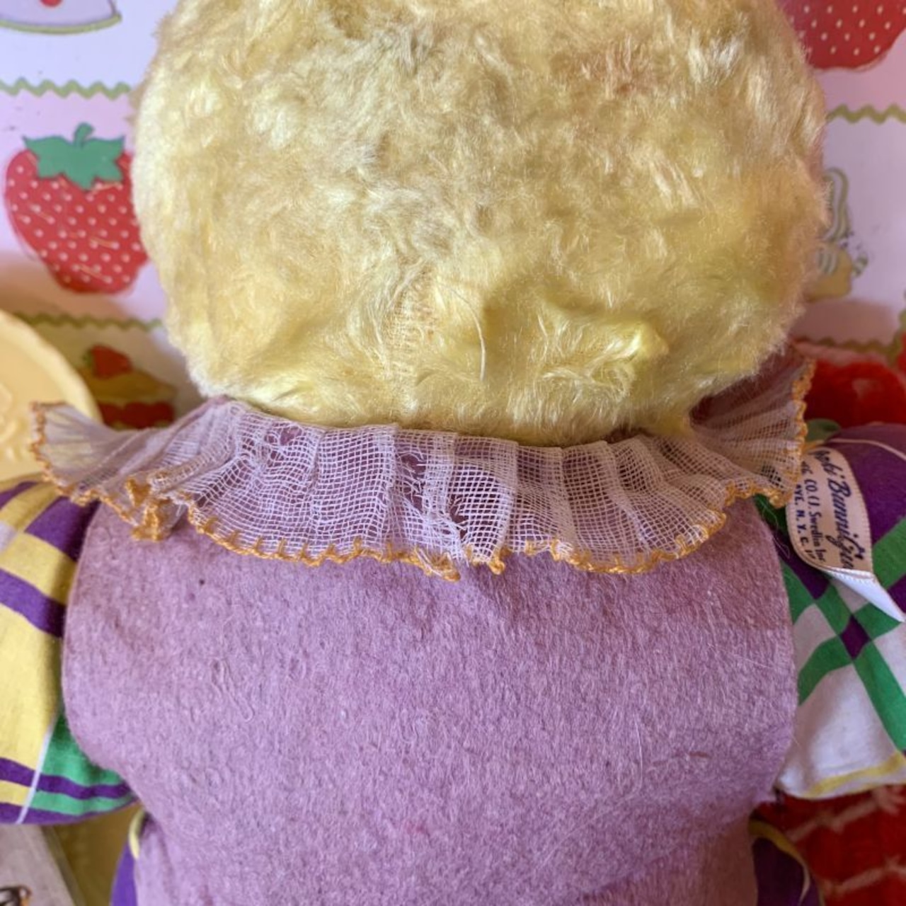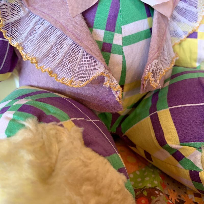 ボアにシミ、フェルト製のお洋服に色褪せやシワのくせ、縁取りのレースに破れなど経年感が見られますが年代の割にきれいな方かと思います。
