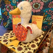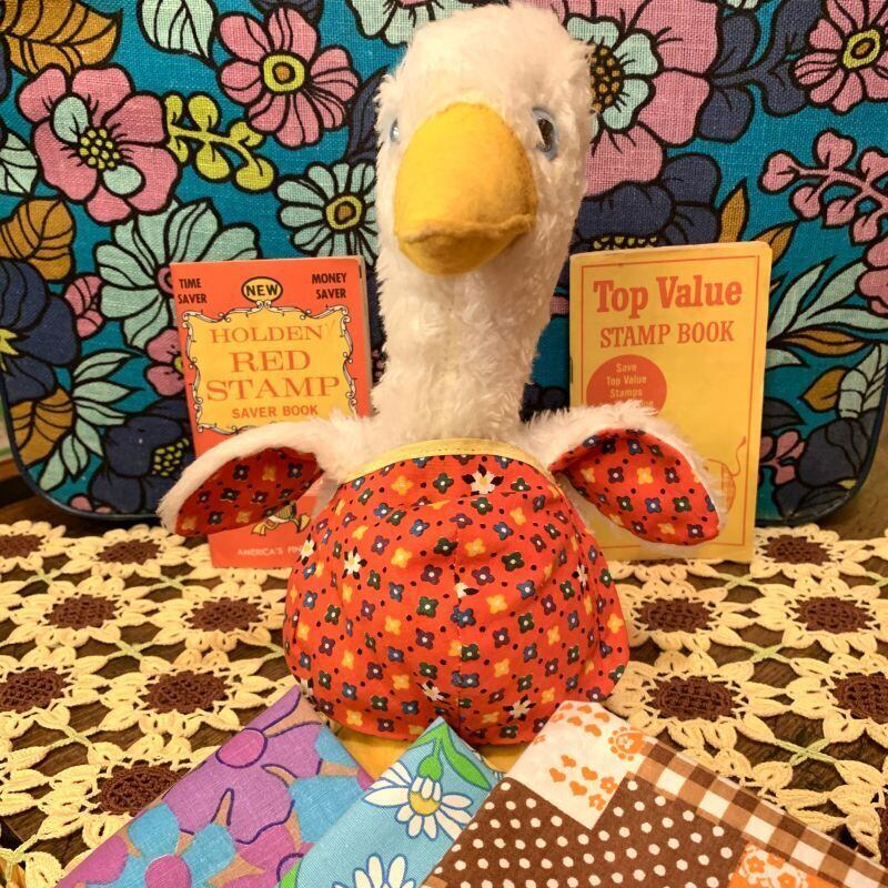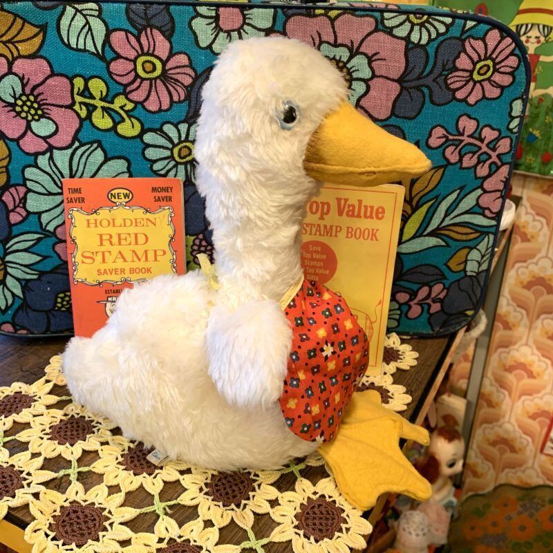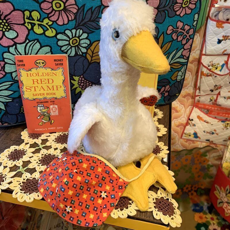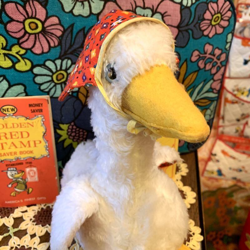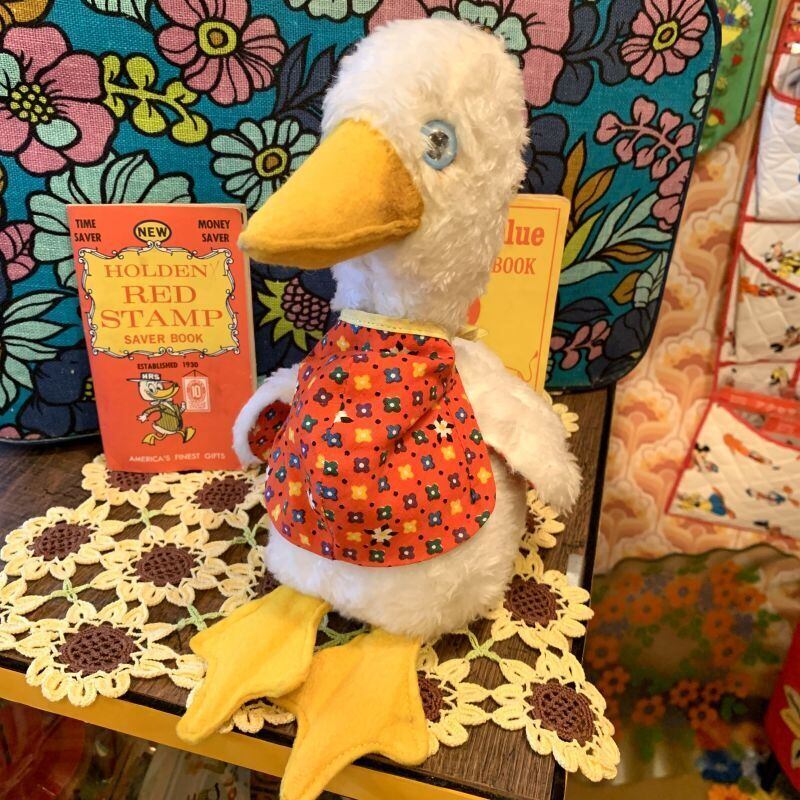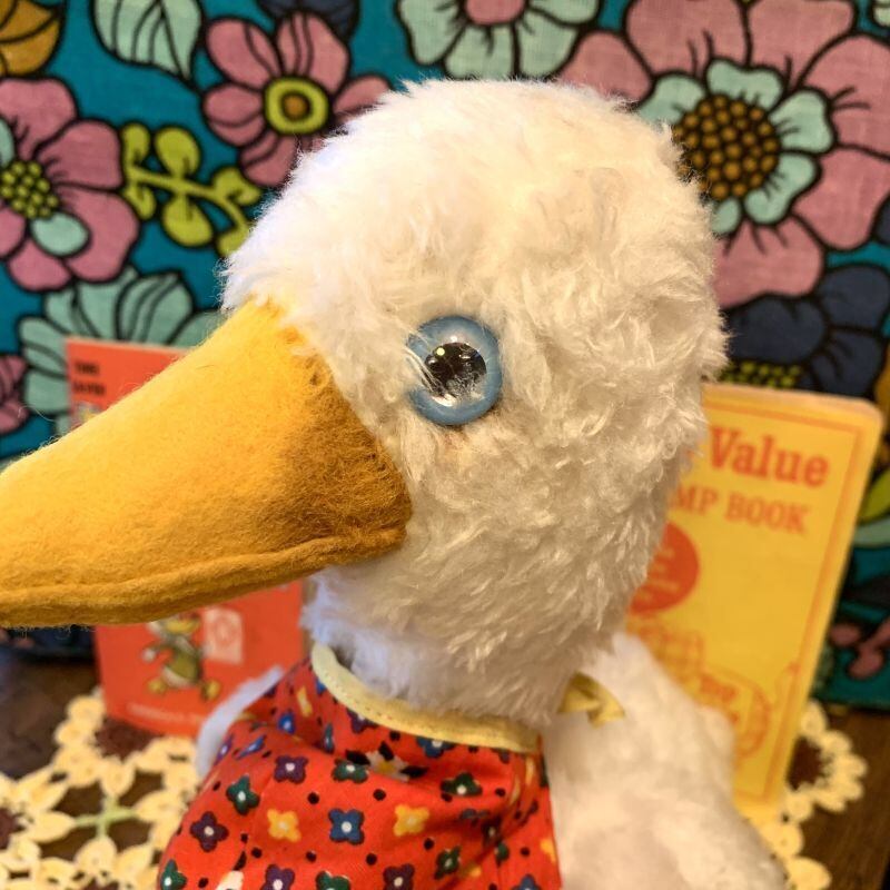 ライトブルーの目にフェルトのくちばしや大きな足、ヴィンテージならではなボアの質感、ポップなフラワー模様の内側の羽根やエプロンがとっても可愛いです。