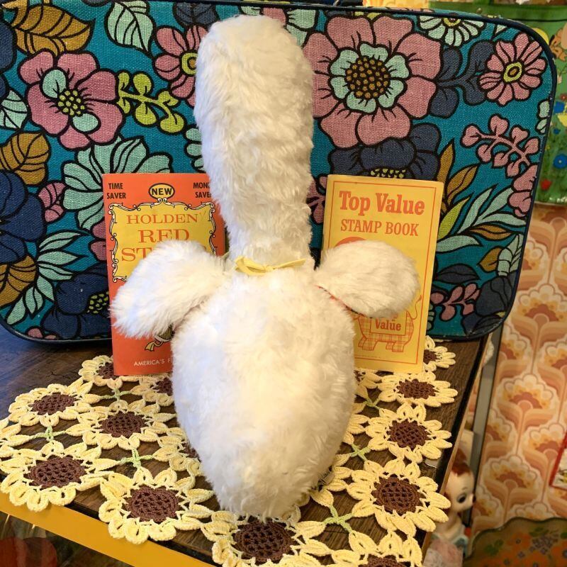 経年による目元、くちばしにシミ、左目にボンド跡のようなシミ、ボアに若干の経年感、足のフェルトにシワのクセが見られますがヴィンテージトイならではな温かみのある可愛い雰囲気です。