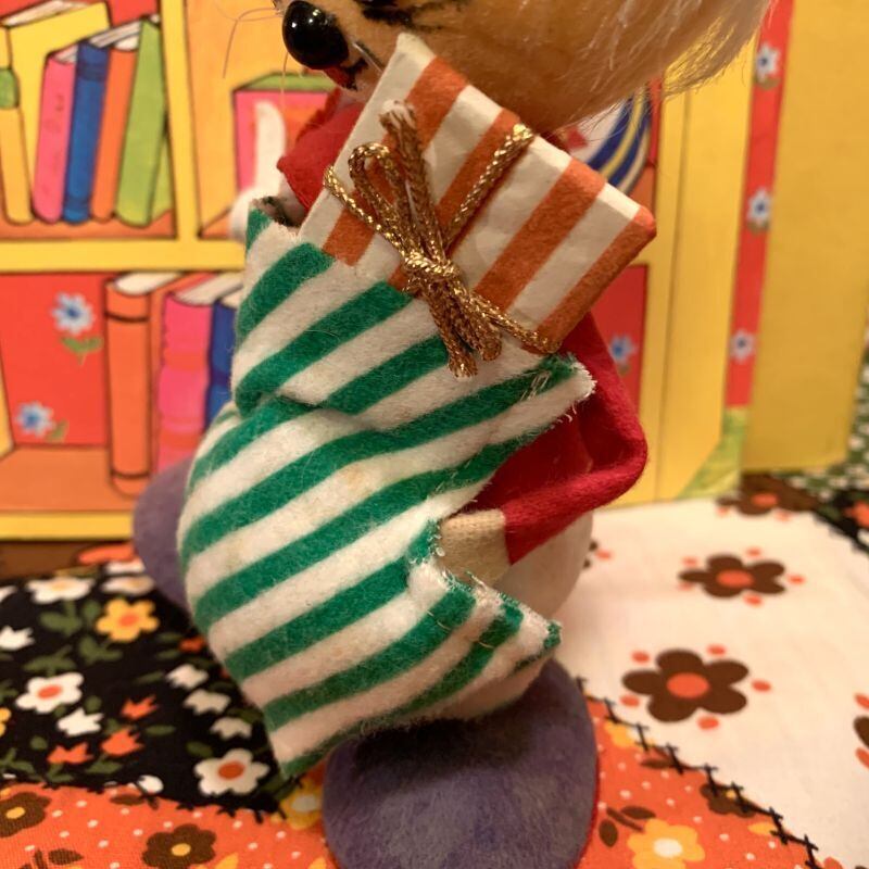 グリーン、ホワイトのストライプが可愛い大きな靴下にプレゼントを持ったネズミさんがとっても可愛いです。