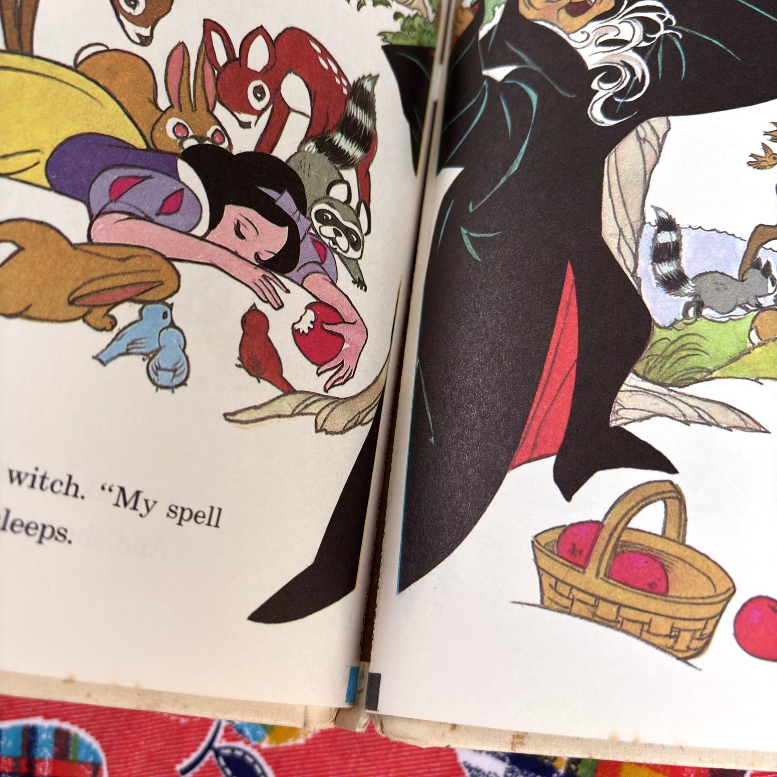 経年によるシミ、角の僅かな折れ、中央より後ろ側の魔女のイラストのページにカバーからの浮きが見られます。