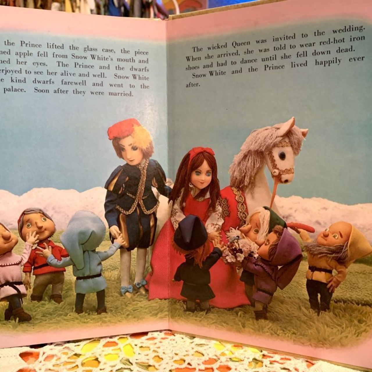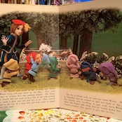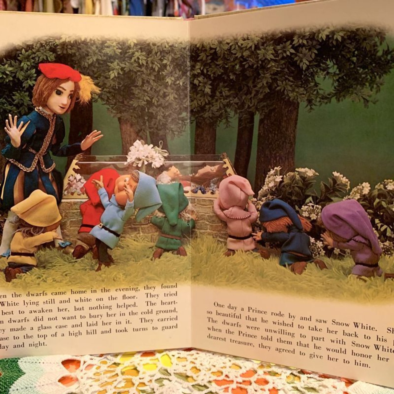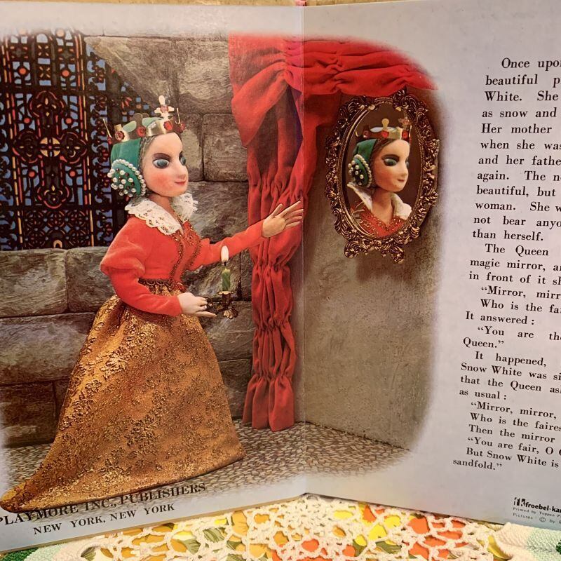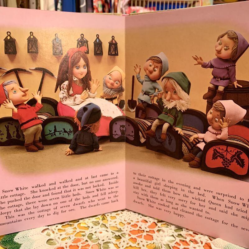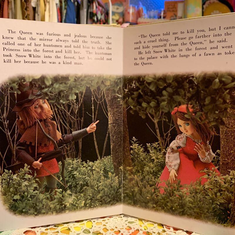 お人形の白雪姫や7人の小人、木やお花が浮きあがってくるようで見ていて楽しい1冊です。