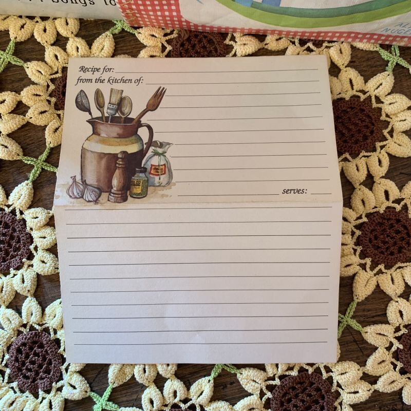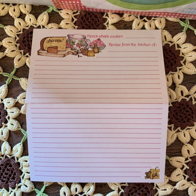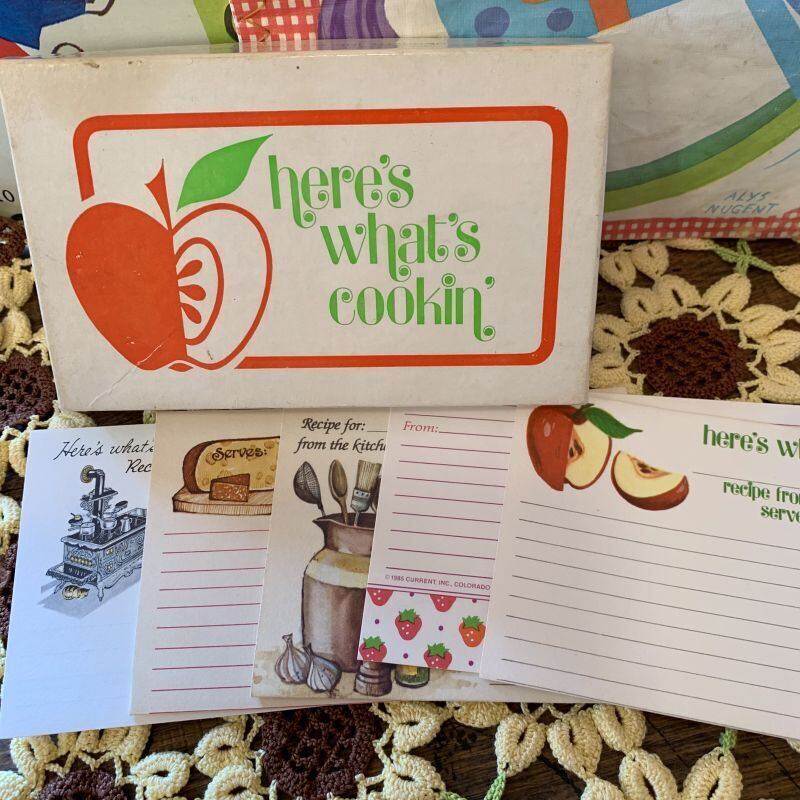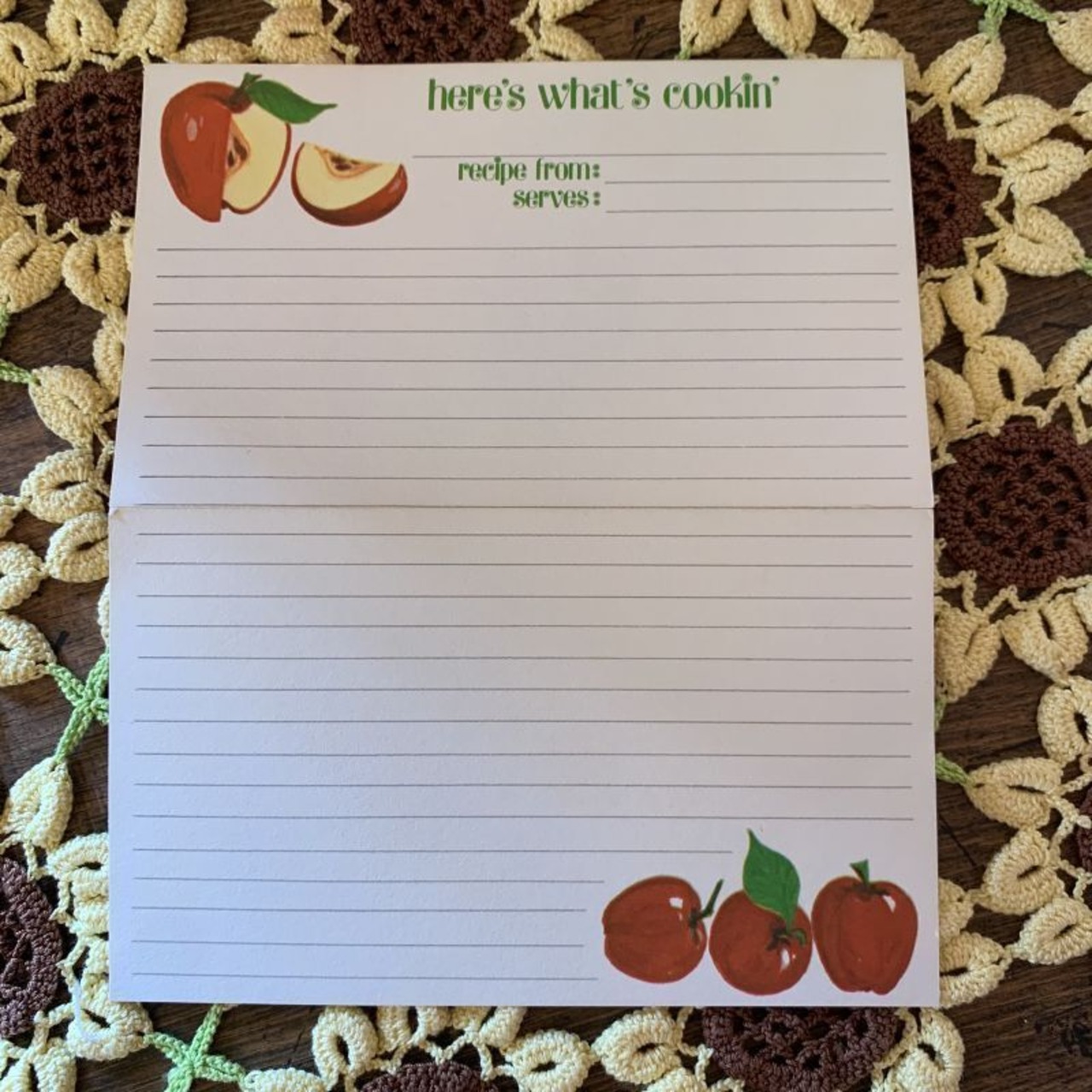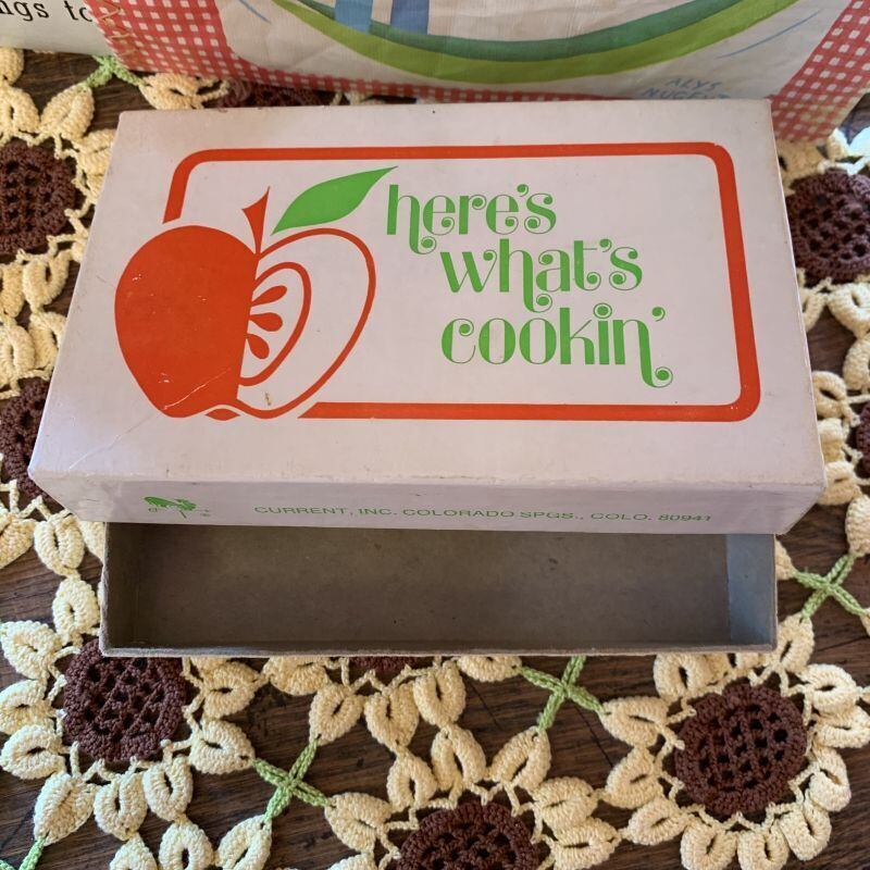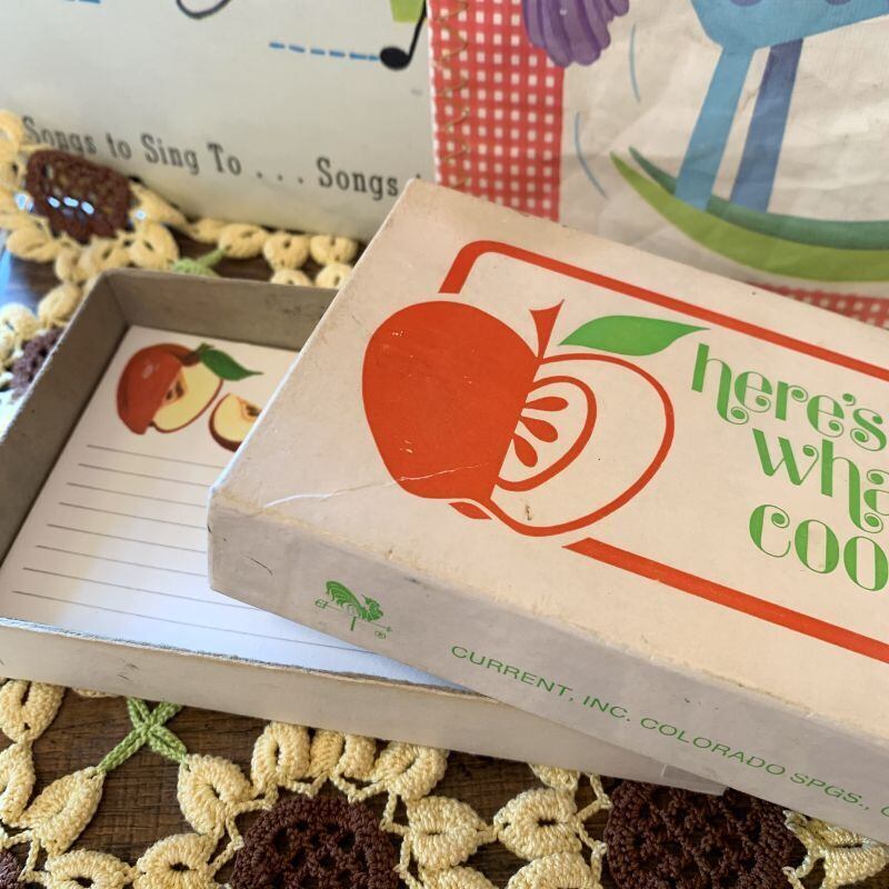 レトロなリンゴのイラストやロゴのフォントが可愛い箱に便箋タイプのカードが3枚、カードが2枚入っています。