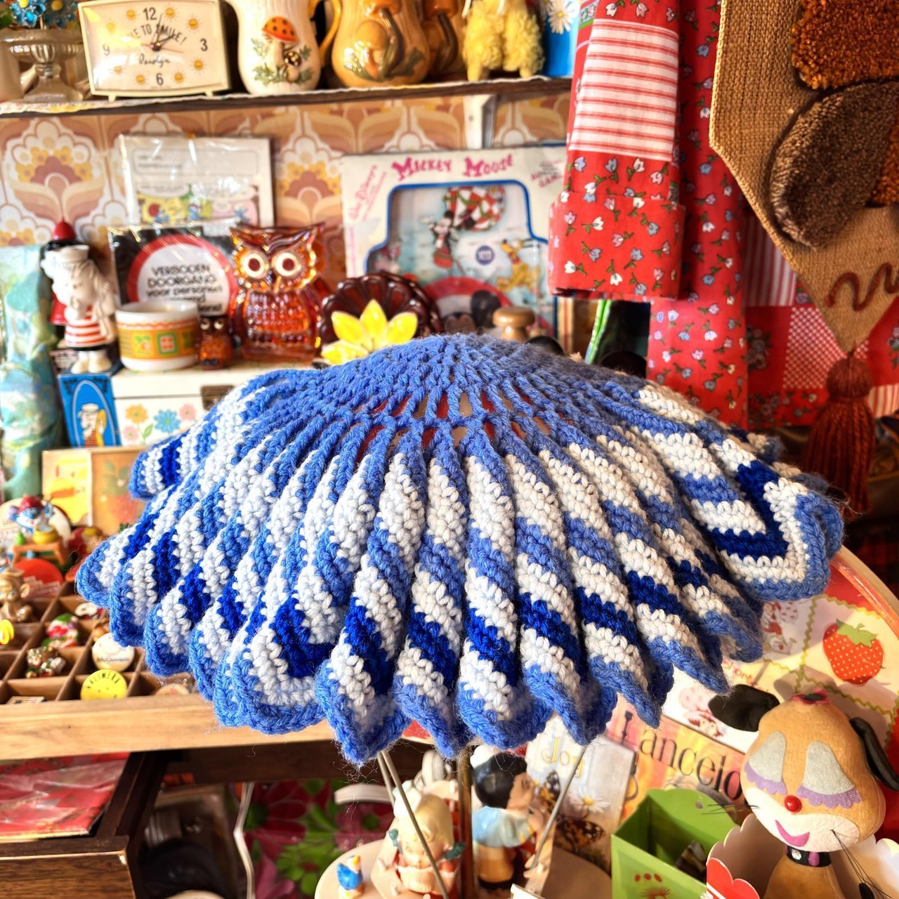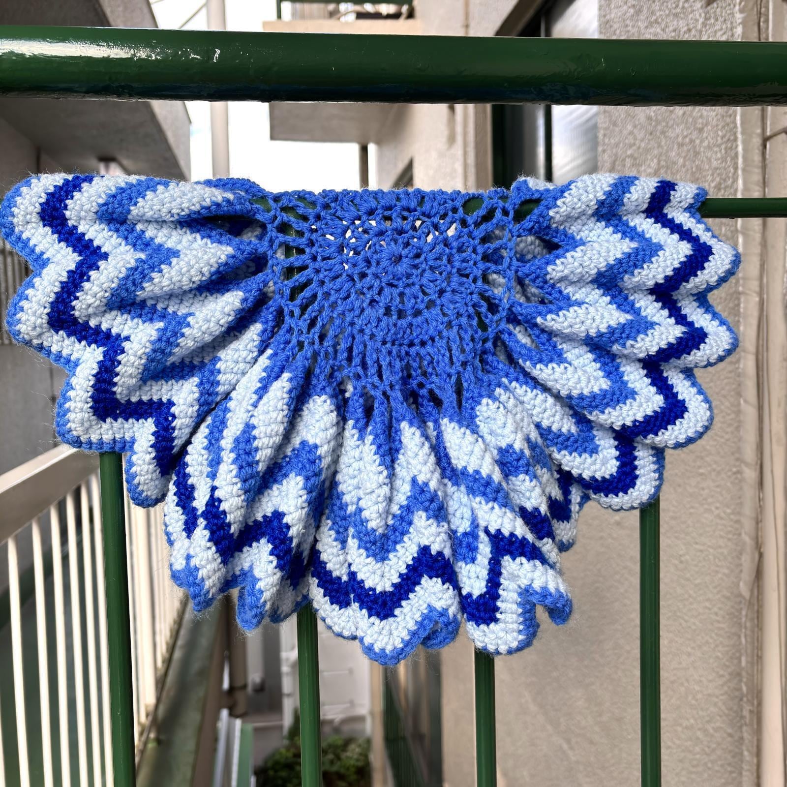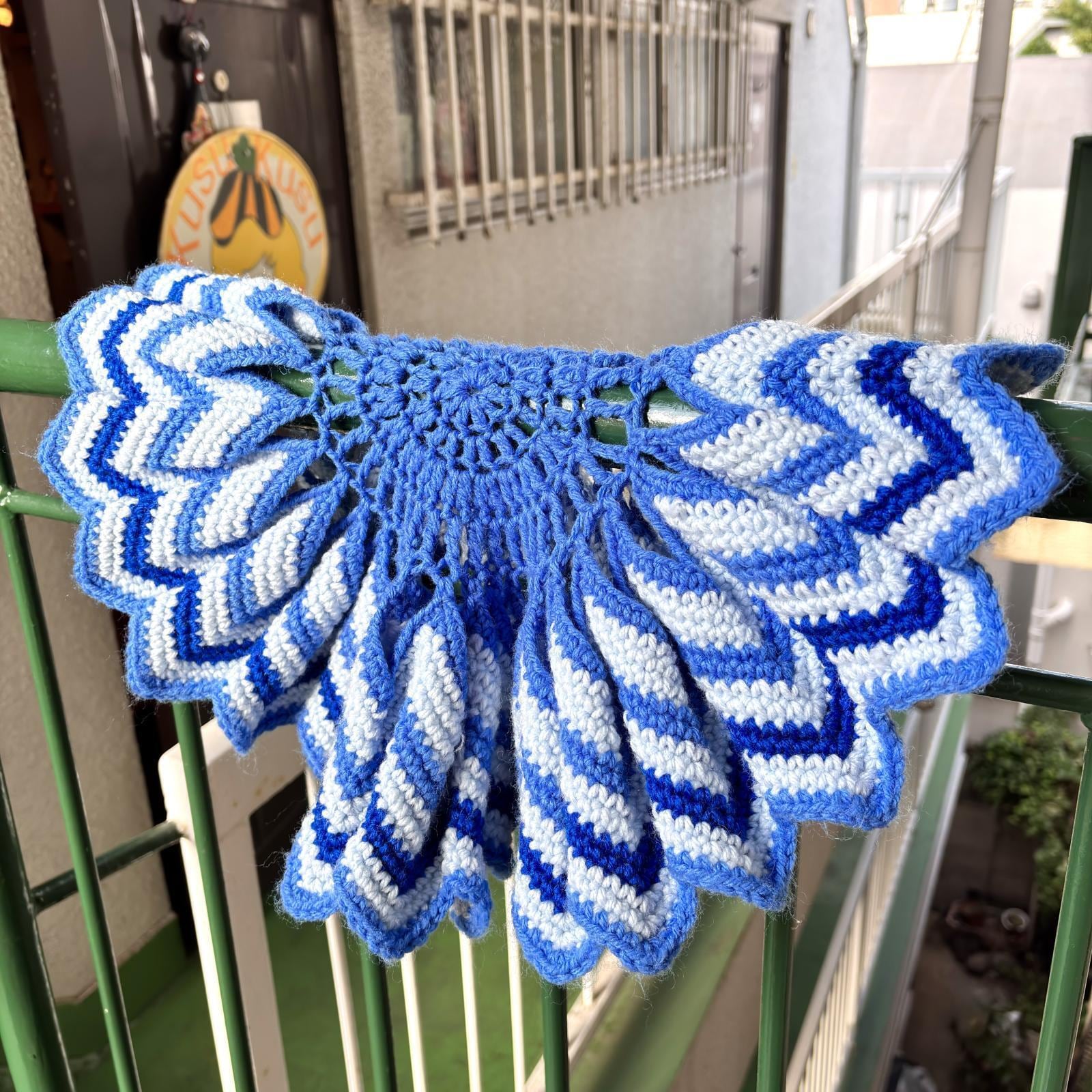 ブルーのグラデーションや花びらのような立体的な編み目のデザインがとっても可愛いアイテムです。