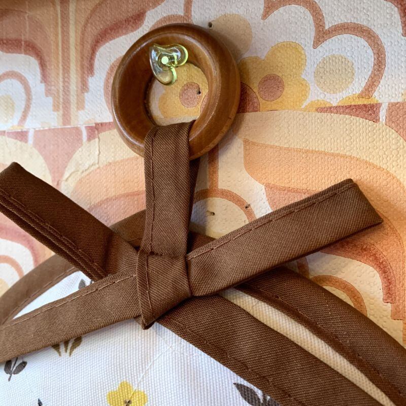 後ろ側はブラウンのキルトのお仕立てです。両面にステッチが入っている作りで、下の方にメーカー名の印字があります。