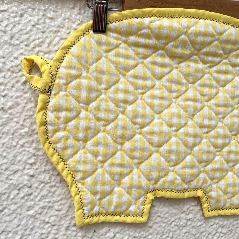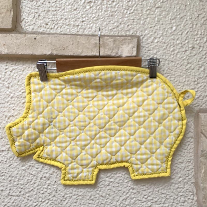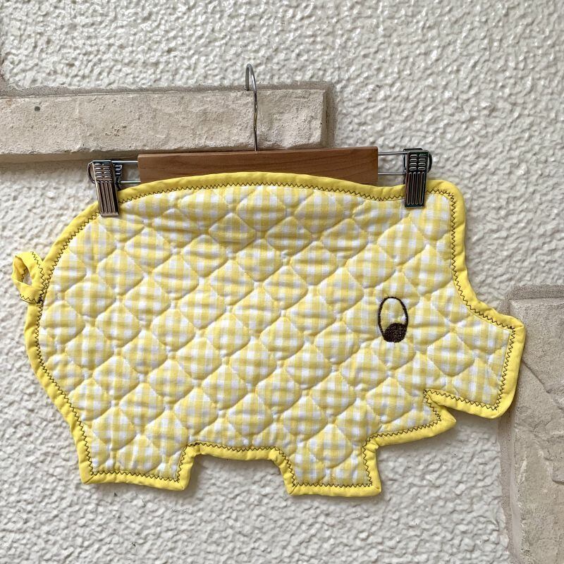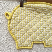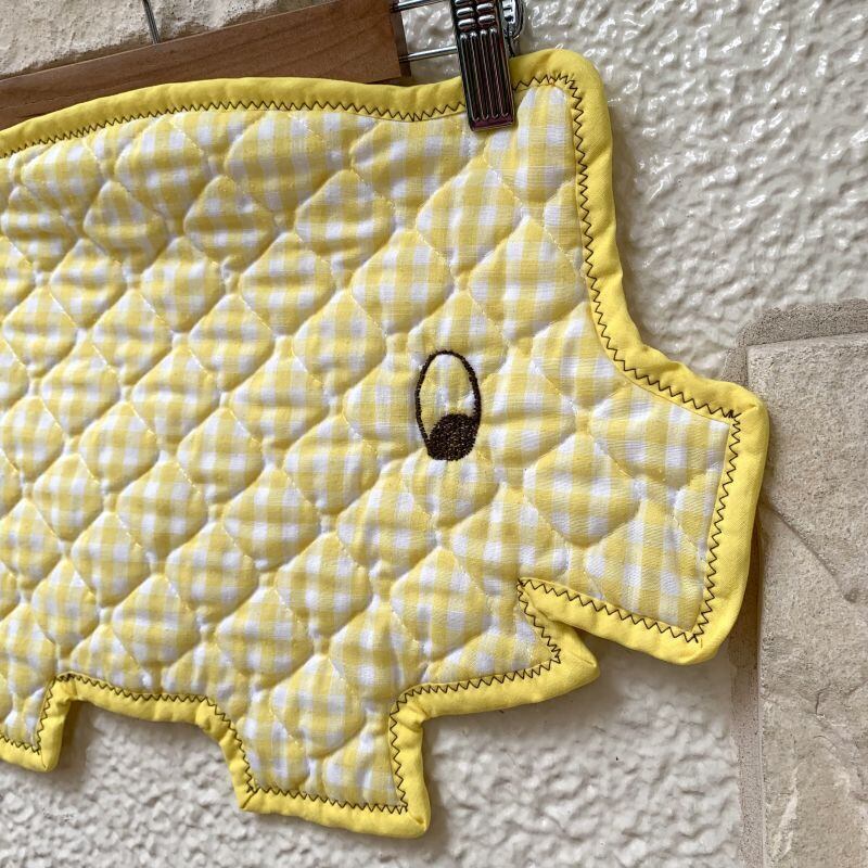 イエロー、ホワイトのギンガムチェックにブラウンのステッチやブタさんのデザインがとっても可愛いアイテムです。