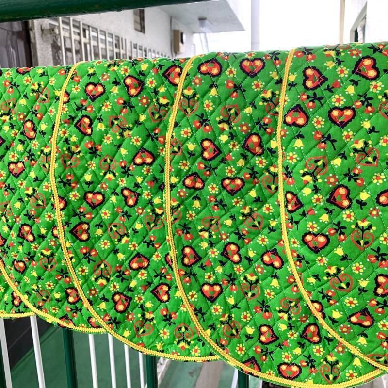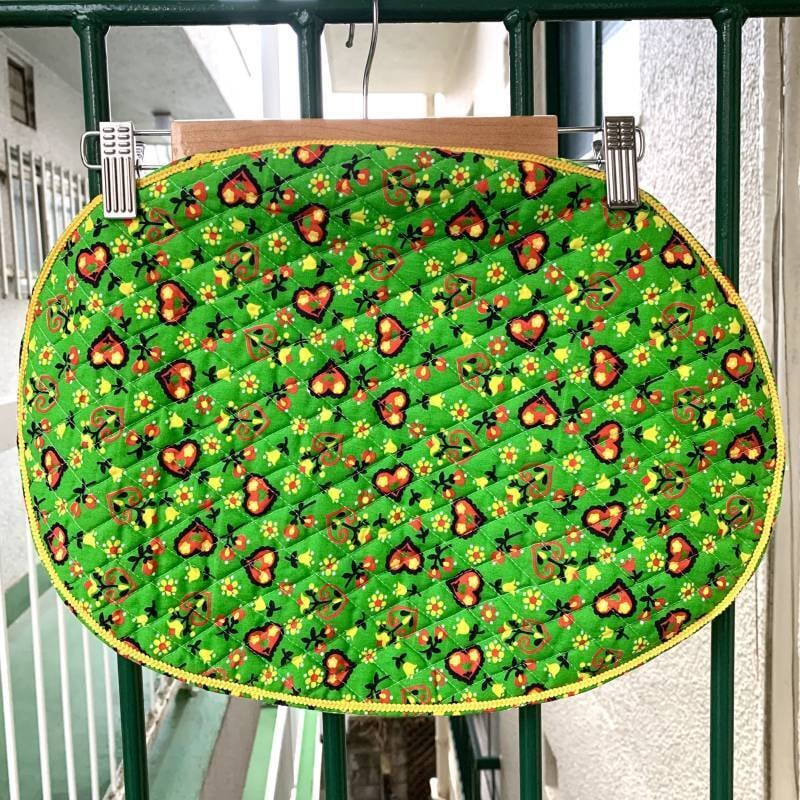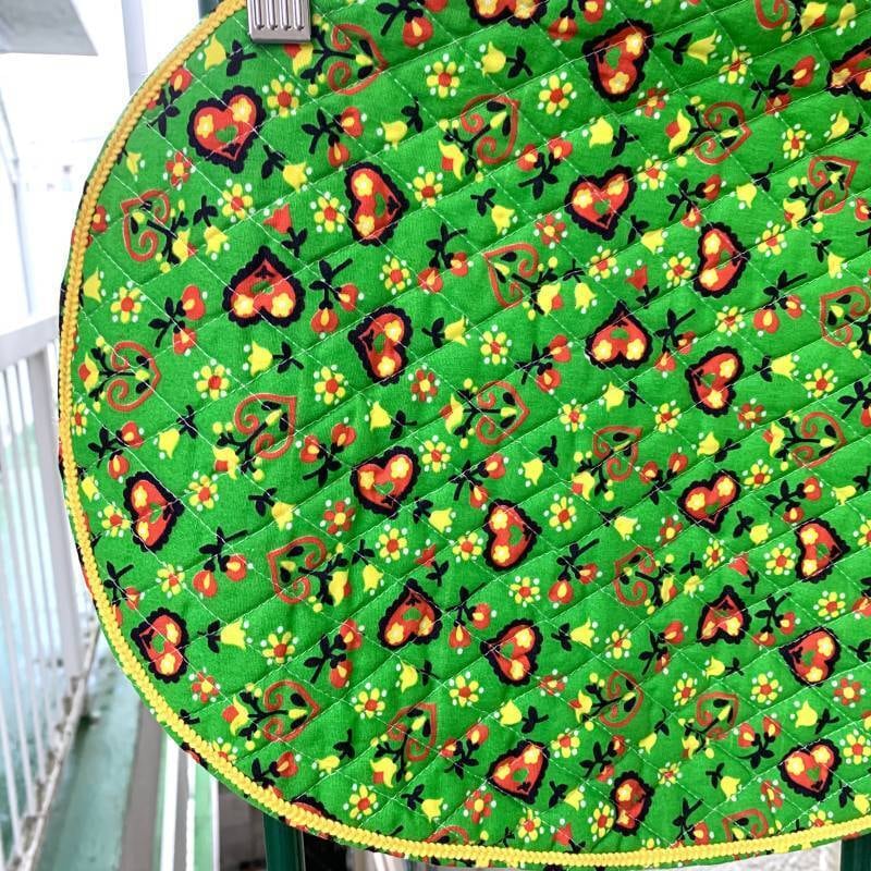 表側はキルティング生地、裏側はライトグリーンの単色の生地の2枚仕立てになっている丁寧な作りも嬉しいポイントです。