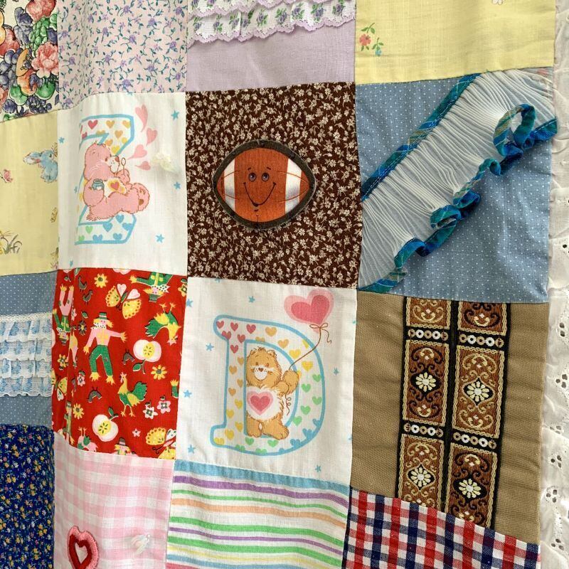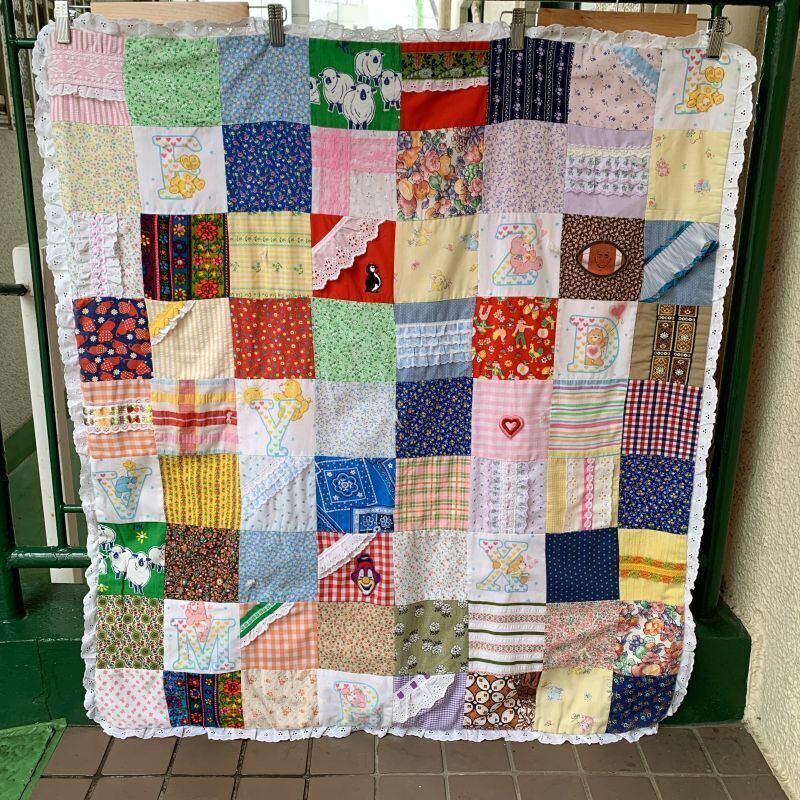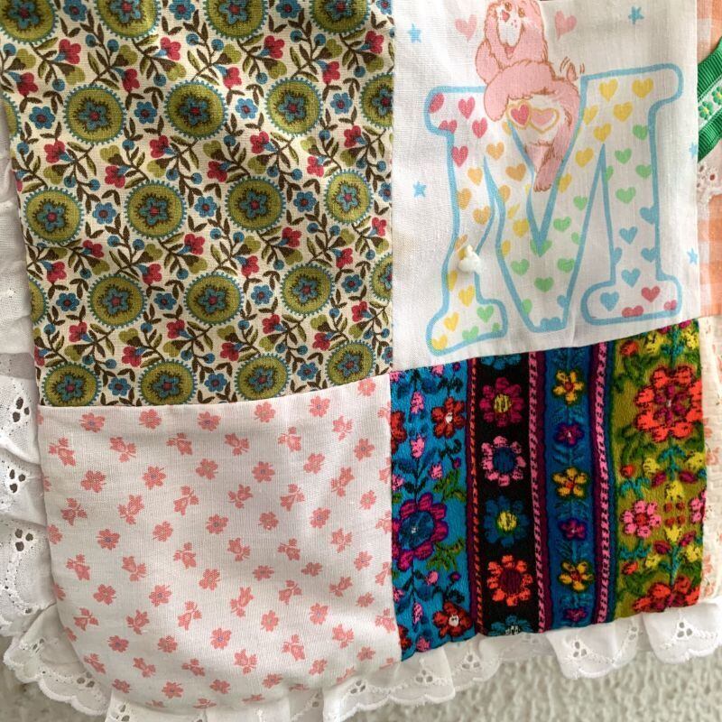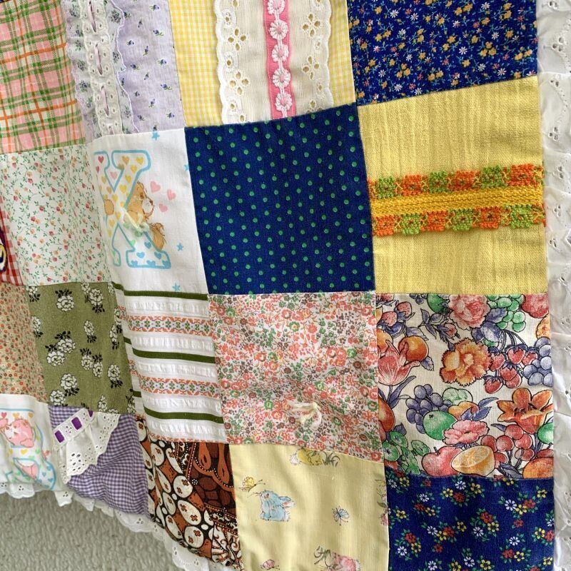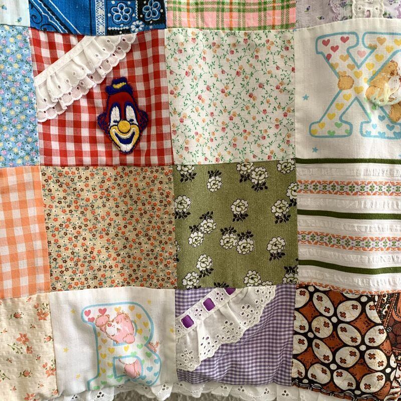 80年代 ヴィンテージ 当時のハンドメイド1点もの ワッペンやフリルリボンのデコレーションが施されたパッチワークのキルトです。