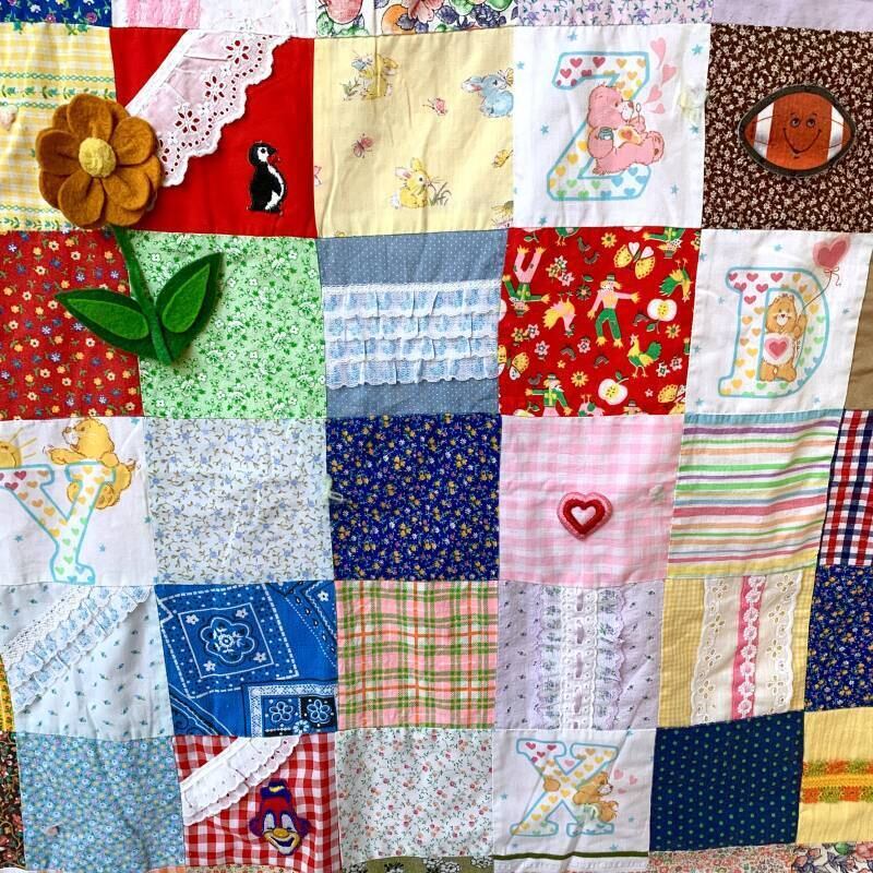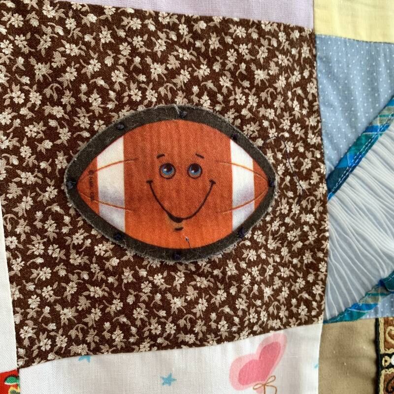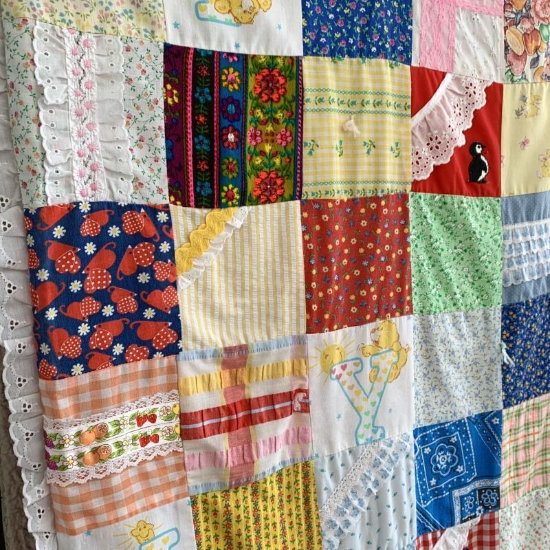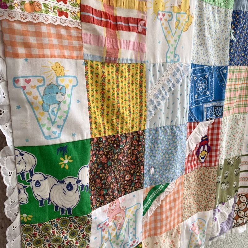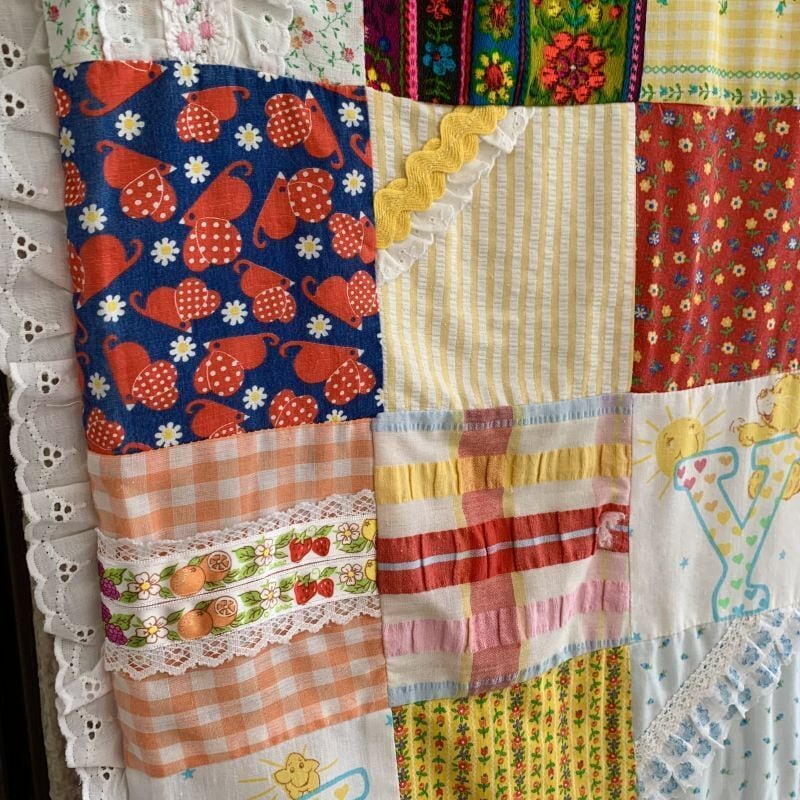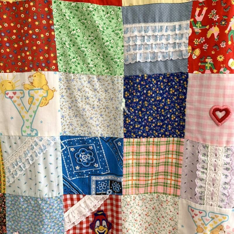 80年代 ヴィンテージ 当時のハンドメイド1点もの ワッペンやフリルリボンのデコレーションが施されたパッチワークのキルトです。