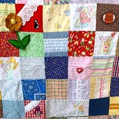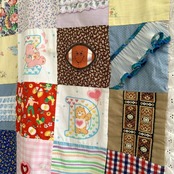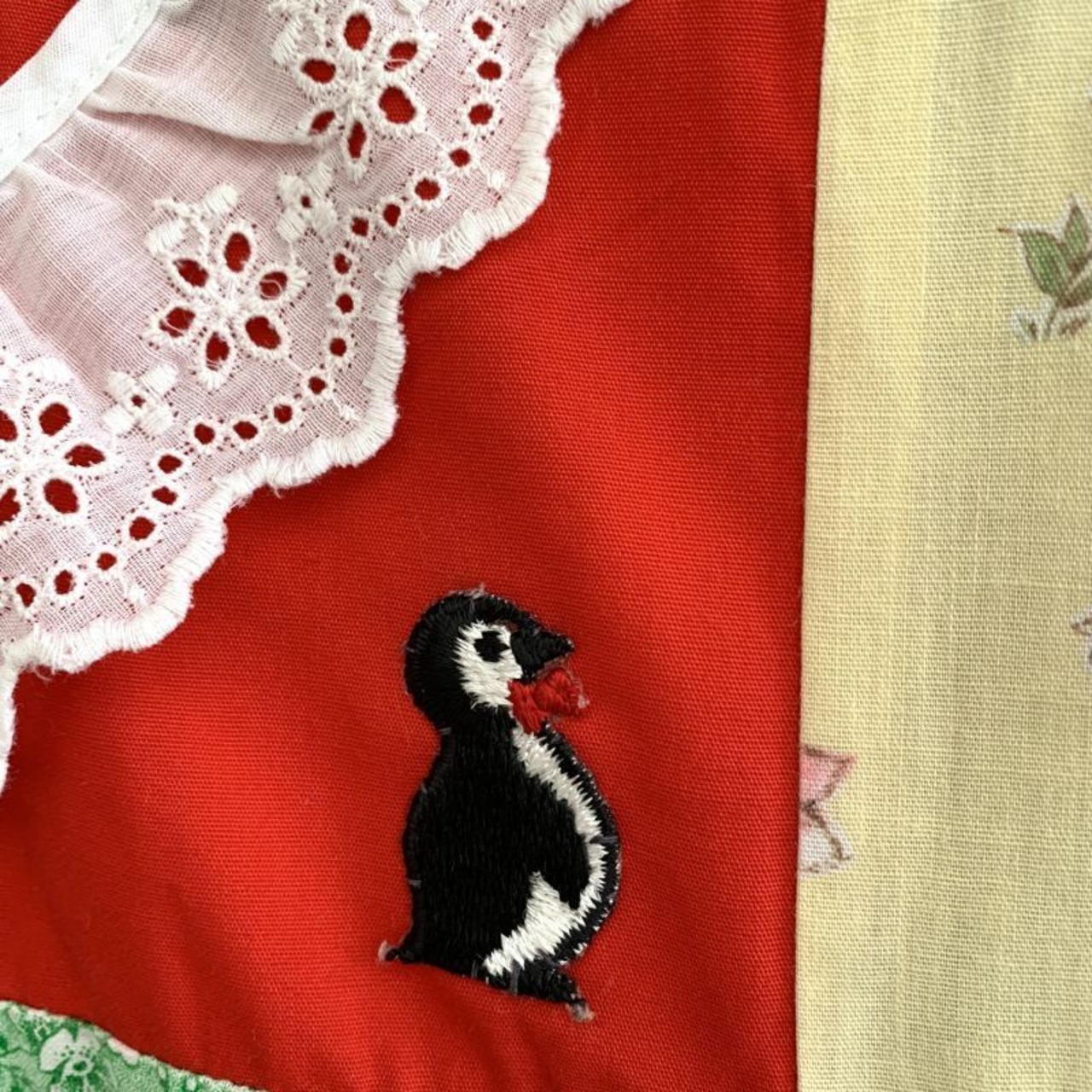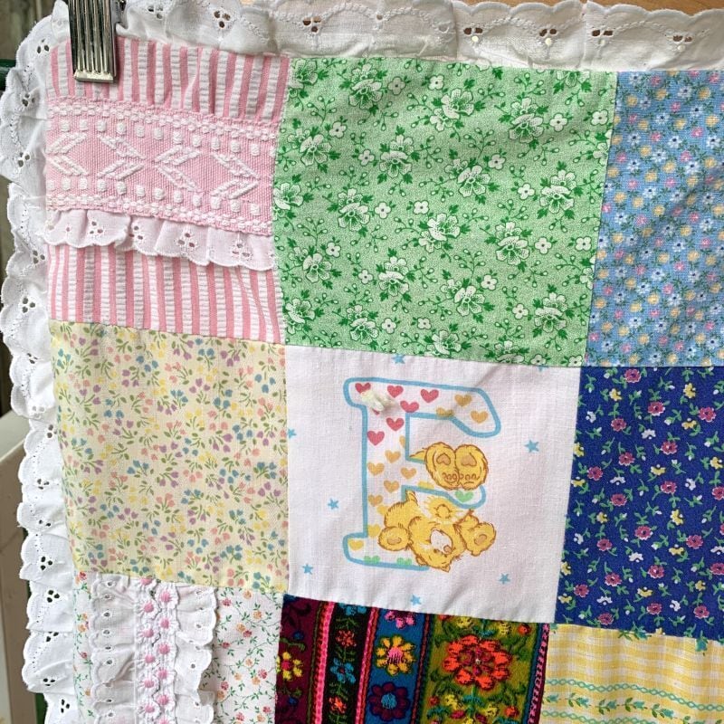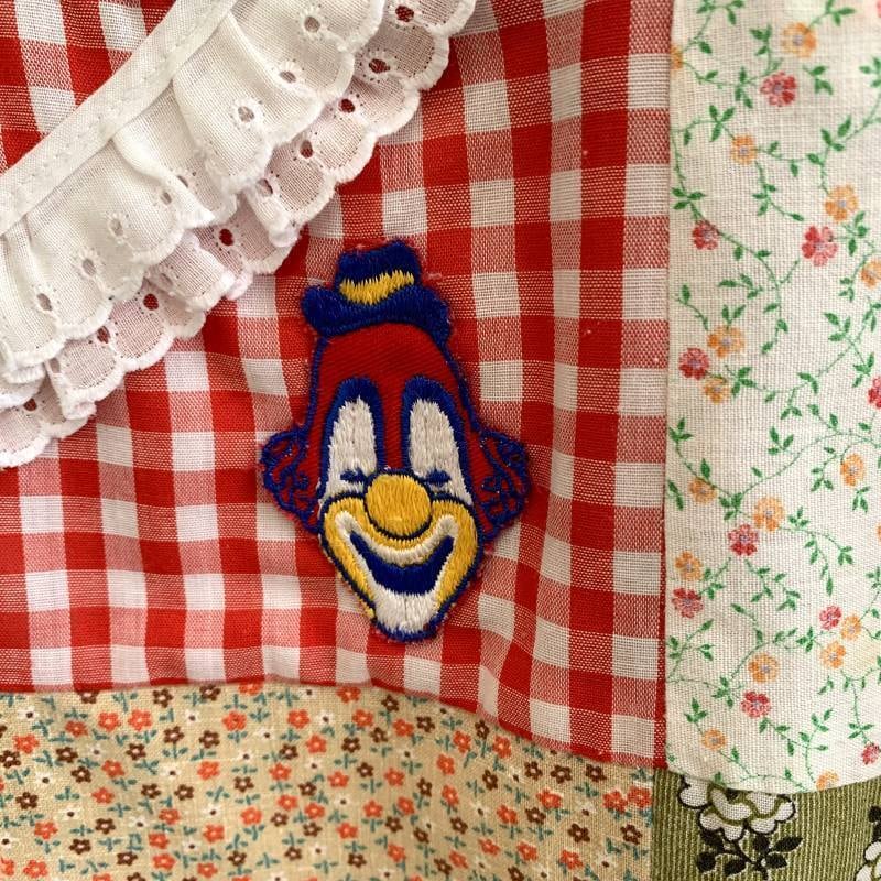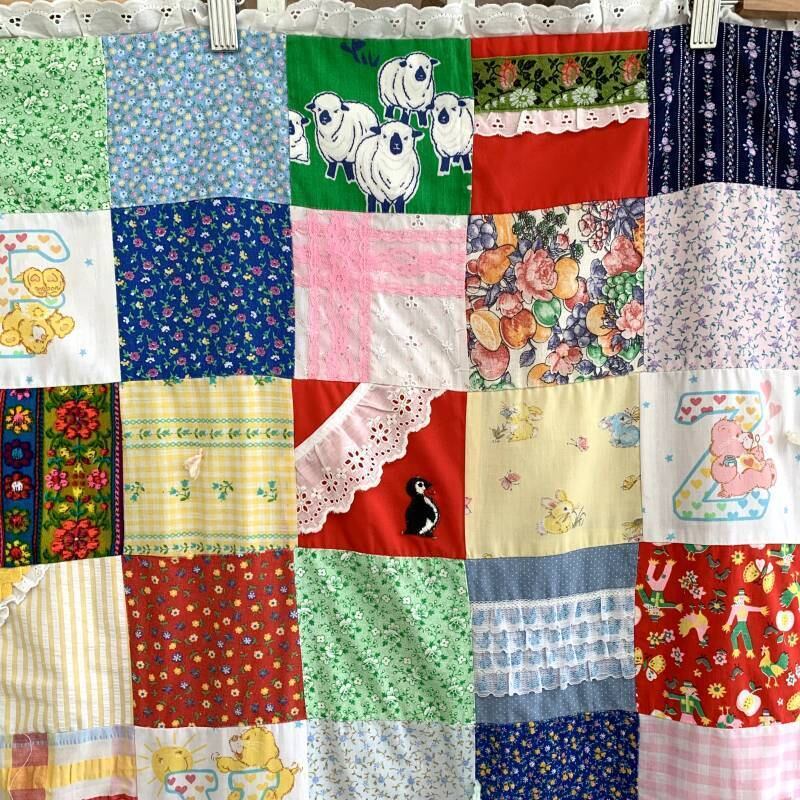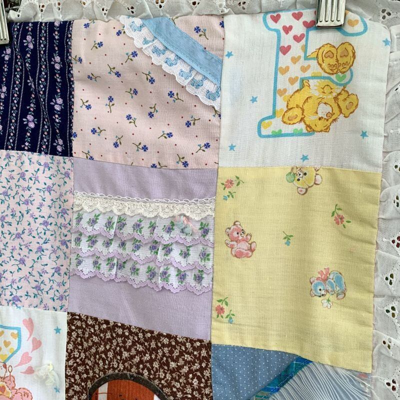フラワー柄やデイジーとネズミさん柄、キュッとした表情の羊さん柄、バンダナ柄やチェック柄、ケアベア柄やフルーツ、蝶モチーフ柄など1枚1枚の生地がとても可愛いデザインで、リアルパッチワークのお仕立てもヴィンテージならではな素敵な雰囲気があります。