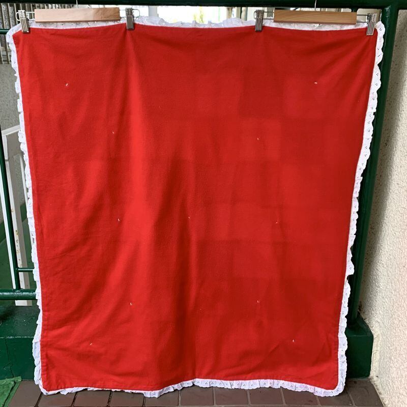 縁取りのフリルの端に僅かな糸のとびだし、生地によって僅かに毛羽立ちのある箇所や色褪せ、ワッペンの淵に僅かな糸のとびだし、裏側のネル生地に若干の毛羽立ちが見られますが全体的にきれいな方かと思います。