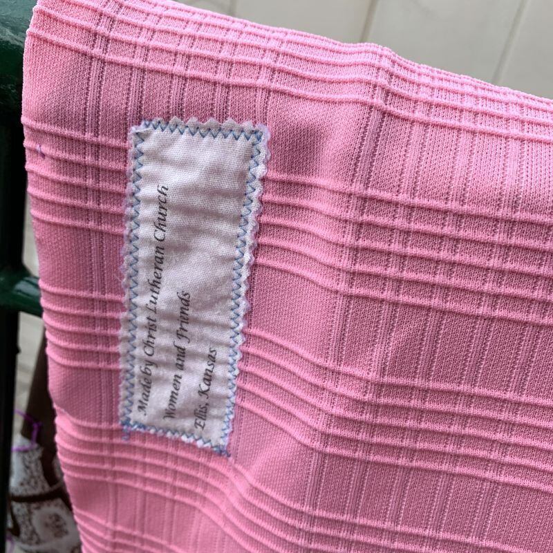 裏地は立体感のあるラインの入ったライトピンクのポリ生地で、メッセージ入りのタグも可愛いポイントです。