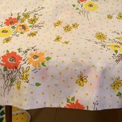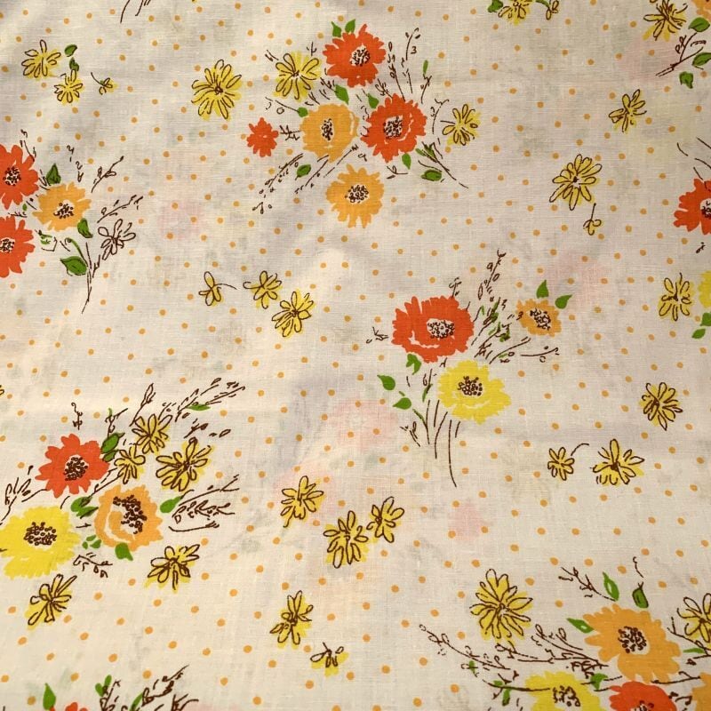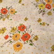 ホワイトベースにライトオレンジのピンドット、オレンジ、イエロー、ブラウン、グリーンのフラワー柄が手描きタッチでとっても可愛い雰囲気です。