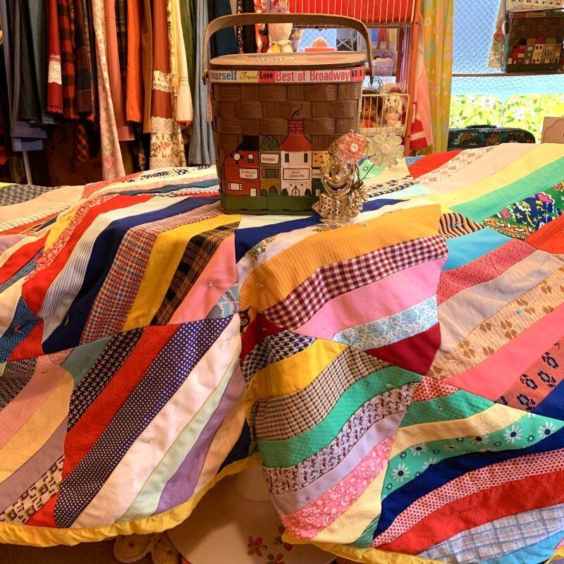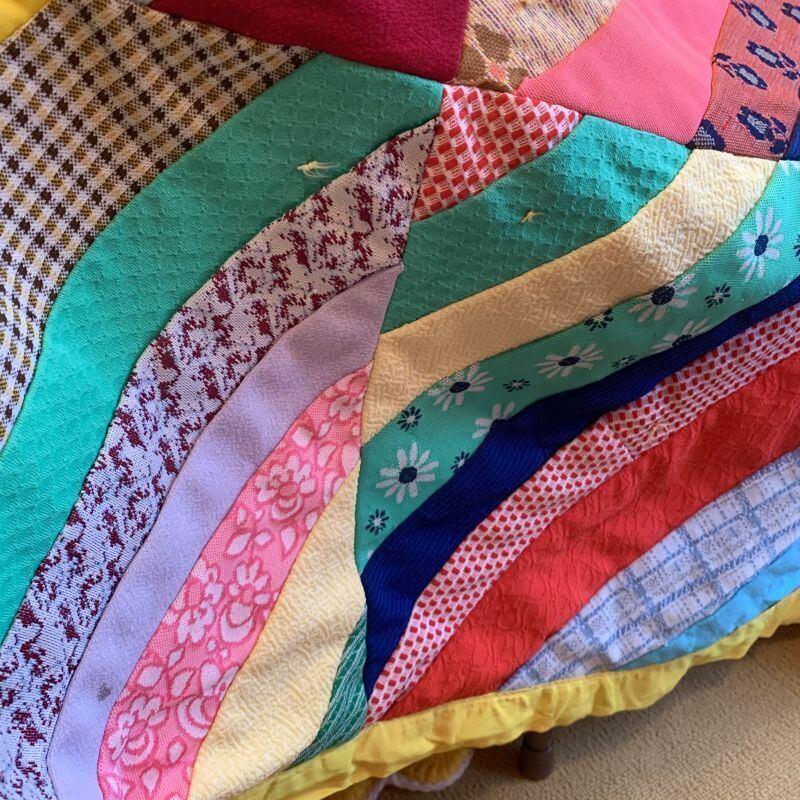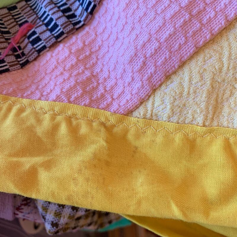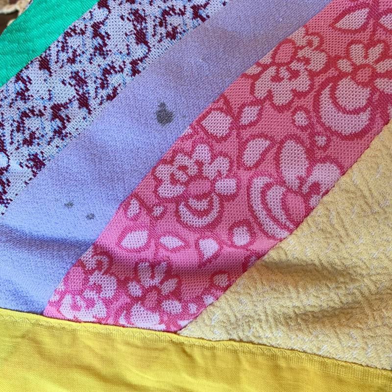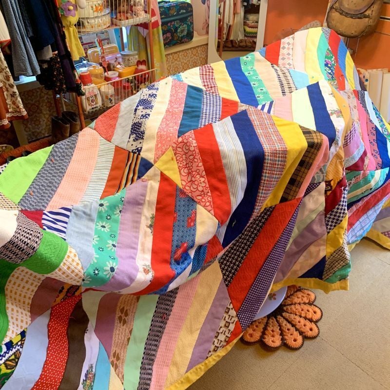 フラワー柄や、チェック柄など当時のポリ生地を贅沢に使用した、とってもカラフルなパッチワークがとっても可愛いキルトです。
