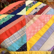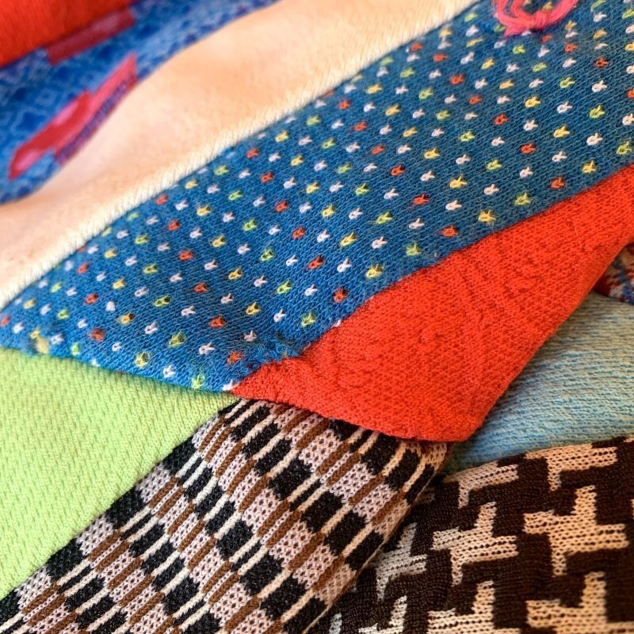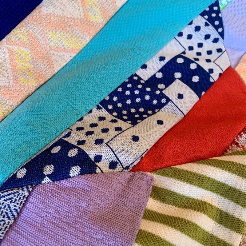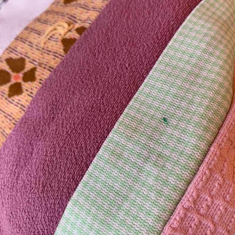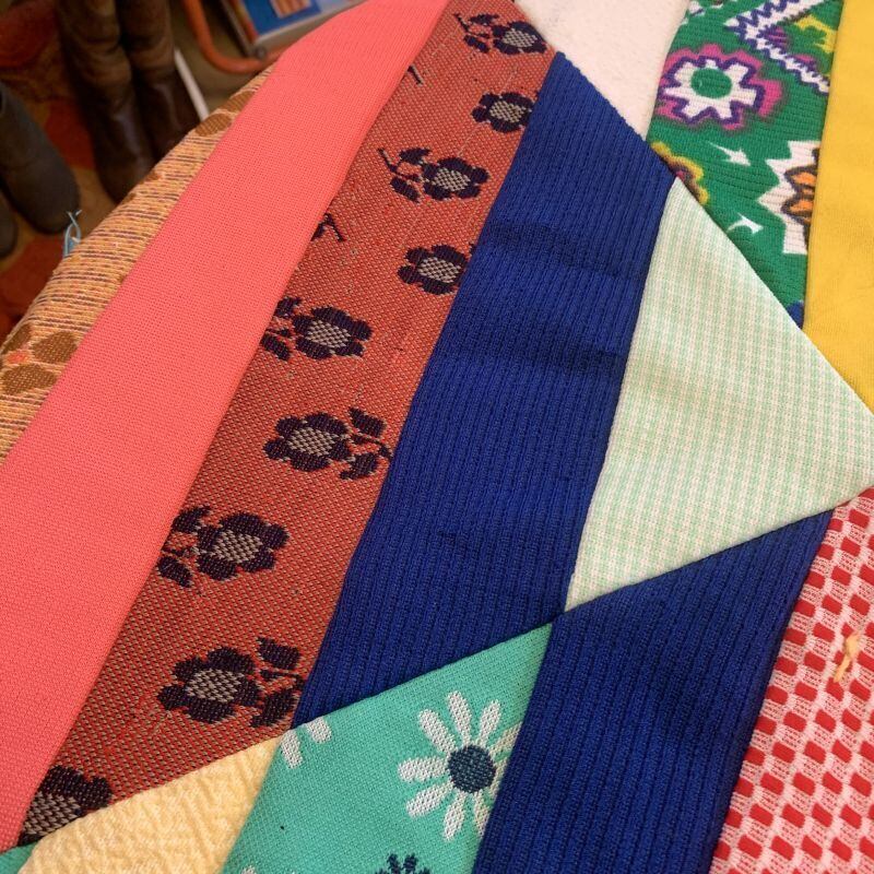 フラワー柄や、チェック柄など当時のポリ生地を贅沢に使用した、とってもカラフルなパッチワークがとっても可愛いキルトです。