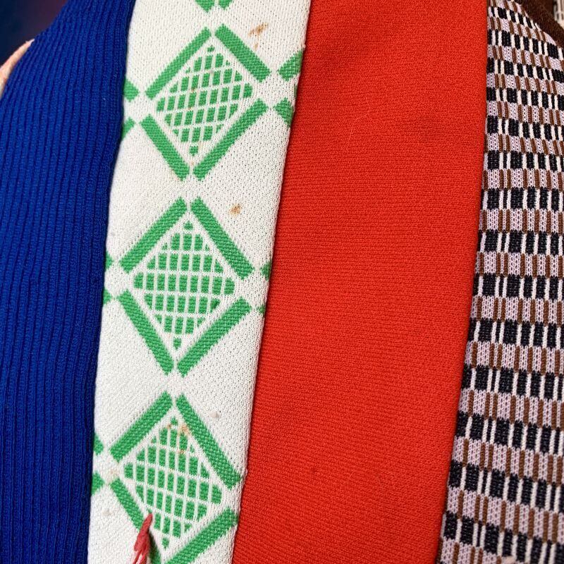 若干のシミ、ペンキのような散り、生地のつれ、1ヶ所破れのリペア、解けた部分のリペア、小さなピンホールなど多少の経年感はありますがお色味も鮮やかで全体的にきれいかと思います。