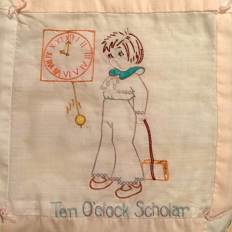 9パターンの女の子や男の子の刺繍が施されていて、マザーグースの羊飼いの女の子や男の子、刺繍のテーマのロゴ刺繍の細やかで丁寧な刺繍は見とれてしまう可愛いさです。
