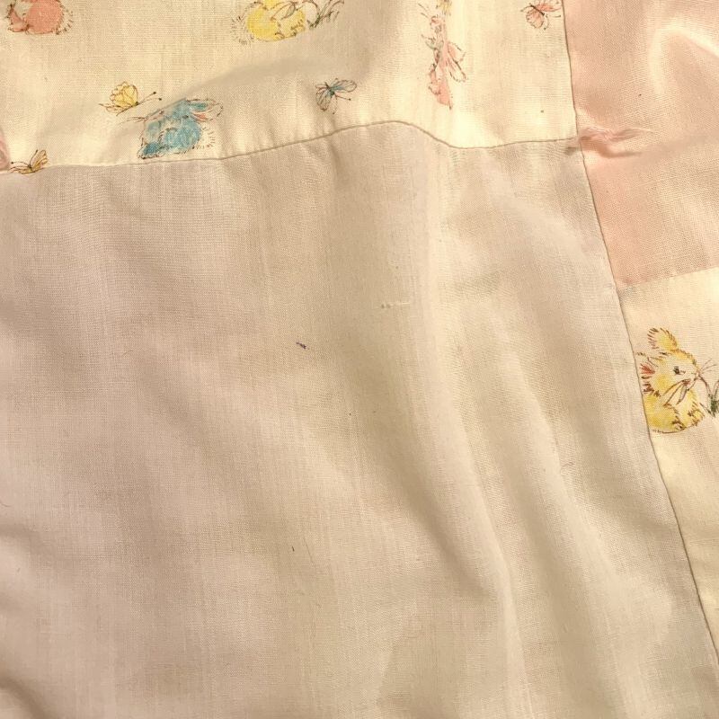 優しいお色味のピンク、イエロー、ホワイトベースのカラーリングでピンクやブルー、イエローのラビット柄の生地とのパッチワークのお仕立てがとっても可愛いです。