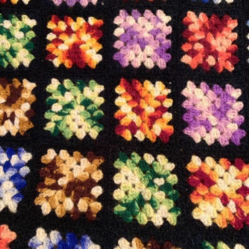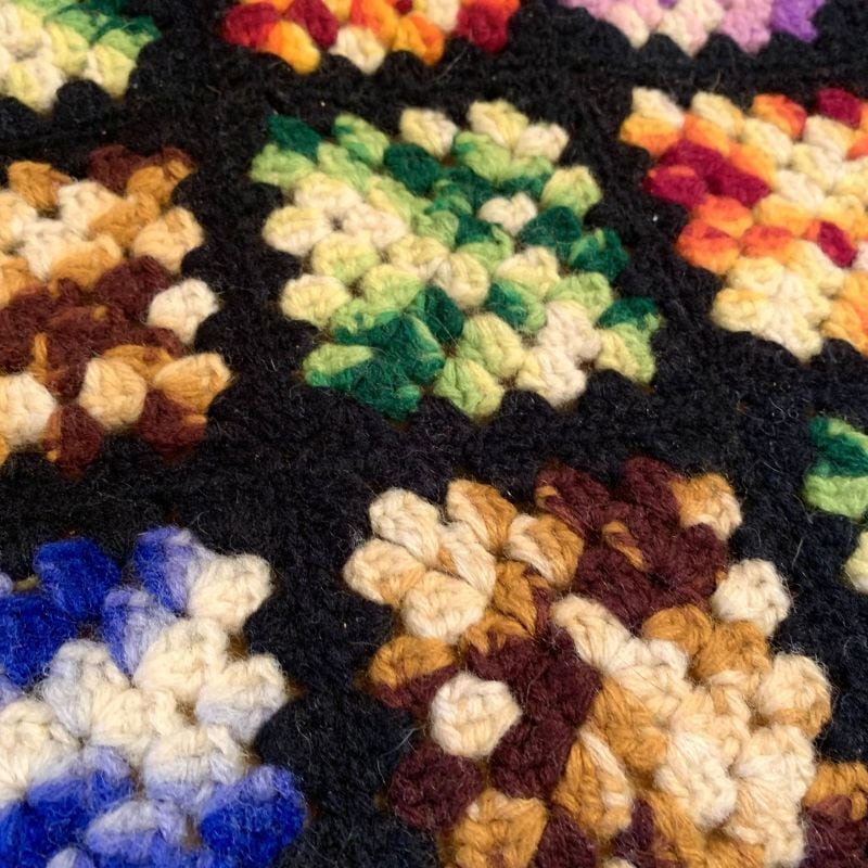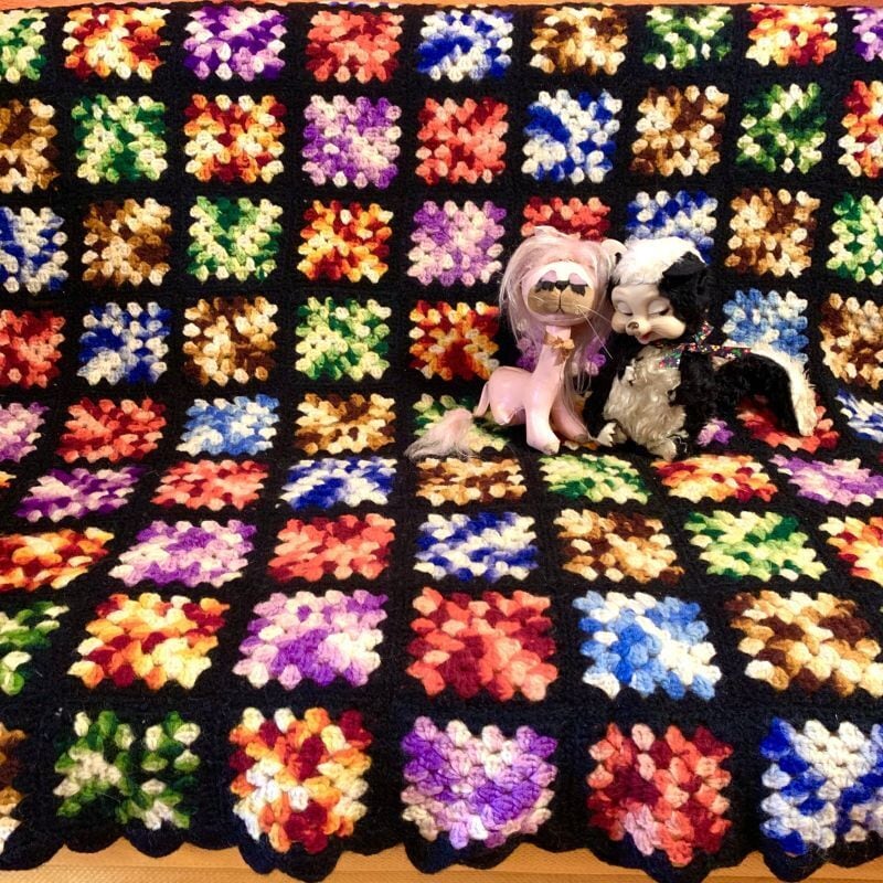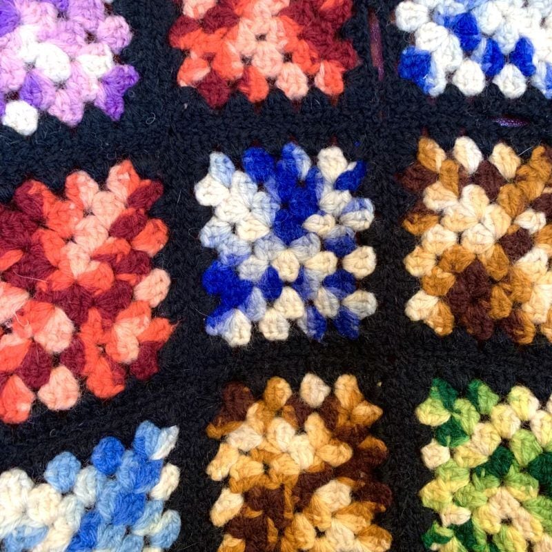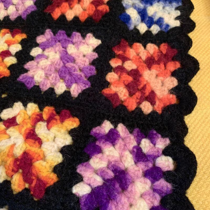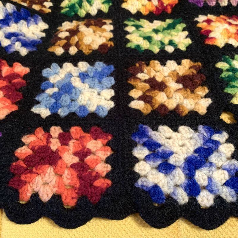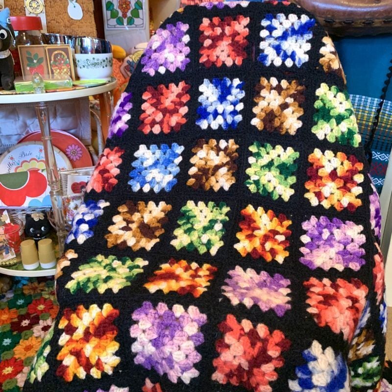 ブラックのふちどりにパープル、オレンジ、グリーン、ブラウン、ブルーのグラデーションカラーのスクエアモチーフがカラフルで温かみのあるとっても可愛いニットブランケットです。なみなみのフチ周りも可愛いお仕立てです。