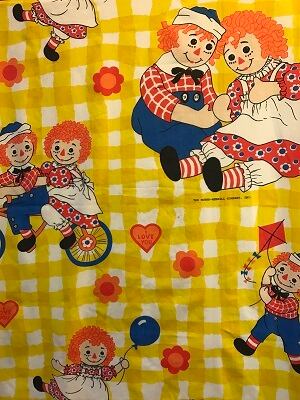 70'S USA BOBBS MERRILL社 Raggedy Ann&Andy Vintage 大判サイズの フラットシーツです。イエローのギンガムチェックに仲良しのアンとアンディの絵柄がとっても可愛いです。レトロなFLOWER模様やI LOVE YOUのハート模様も可愛いですね。経年による点のようなシミや薄っすらとしたシミが所々見られます。若干の経年感はありますが破れなどの大きなダメージはありません。大判サイズなのでいろいろな用途にご使用頂けるかと思います。
