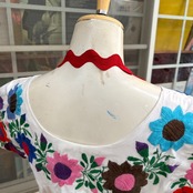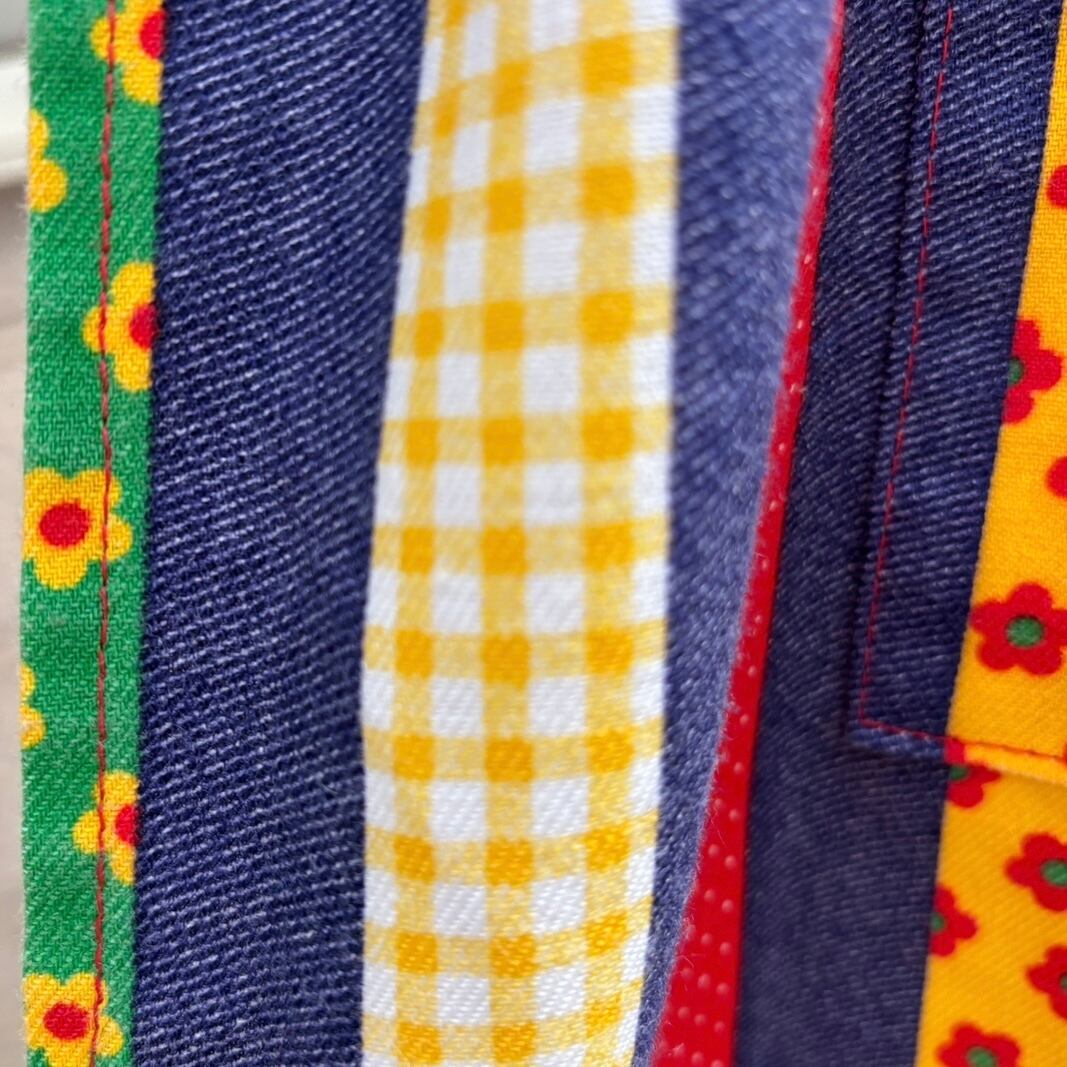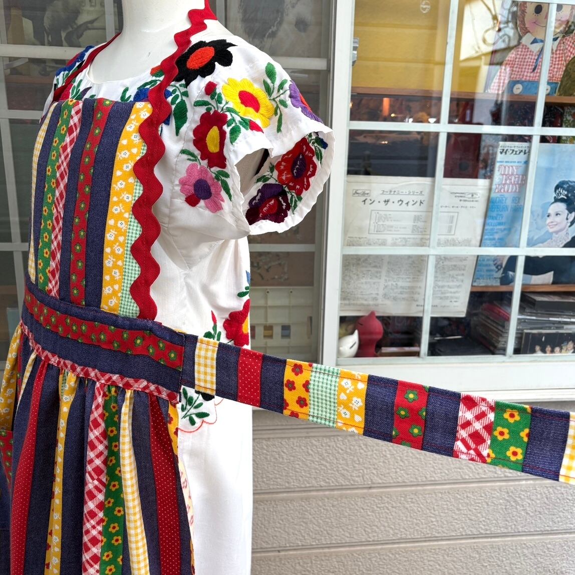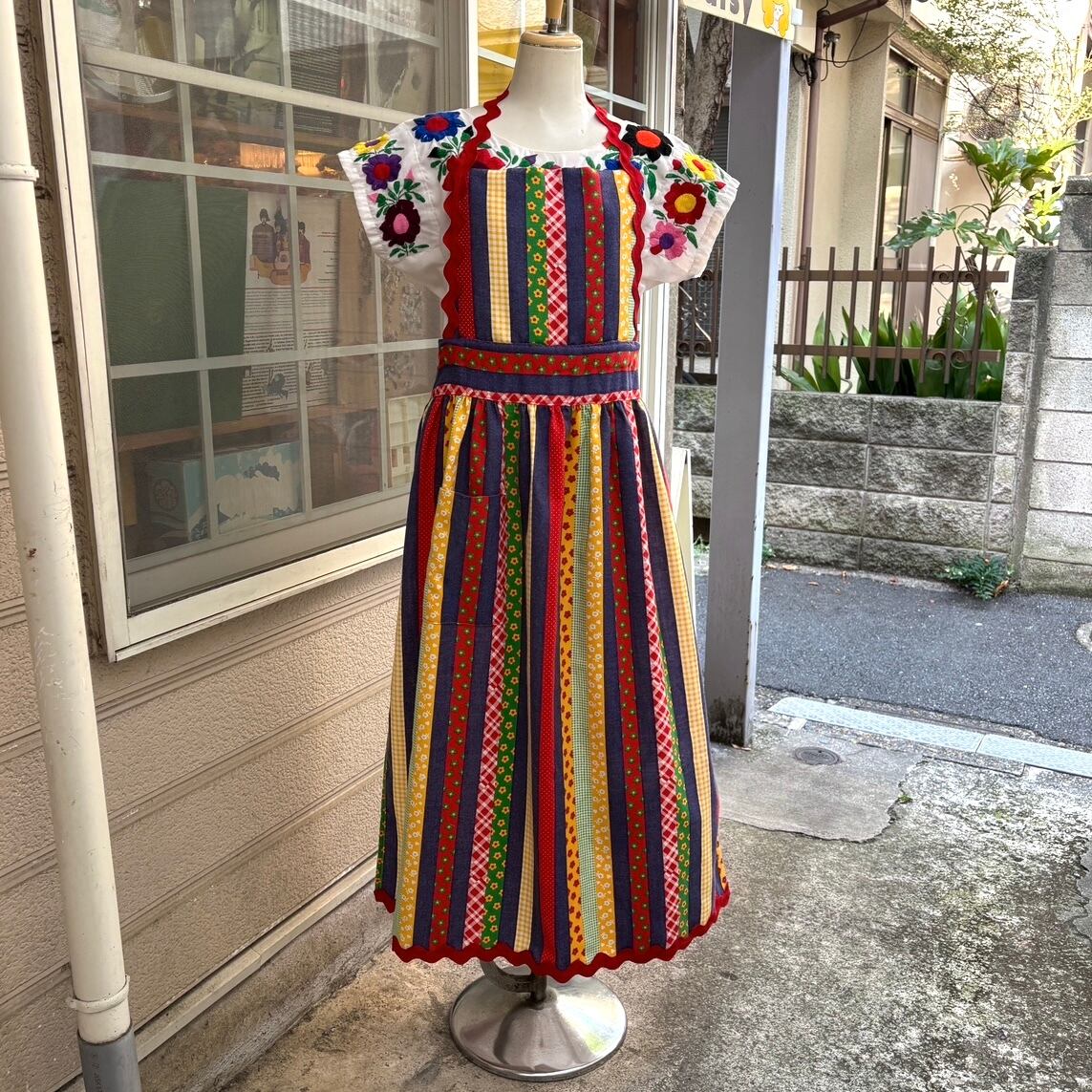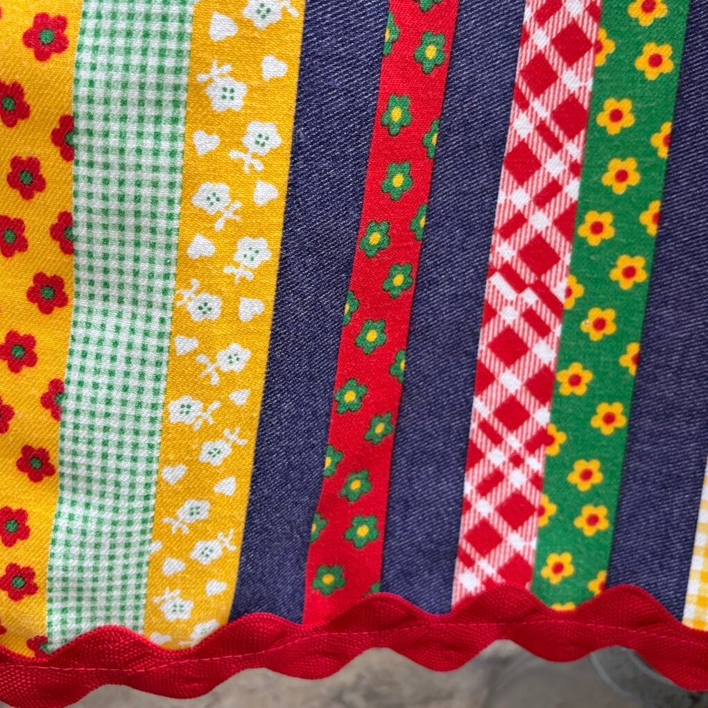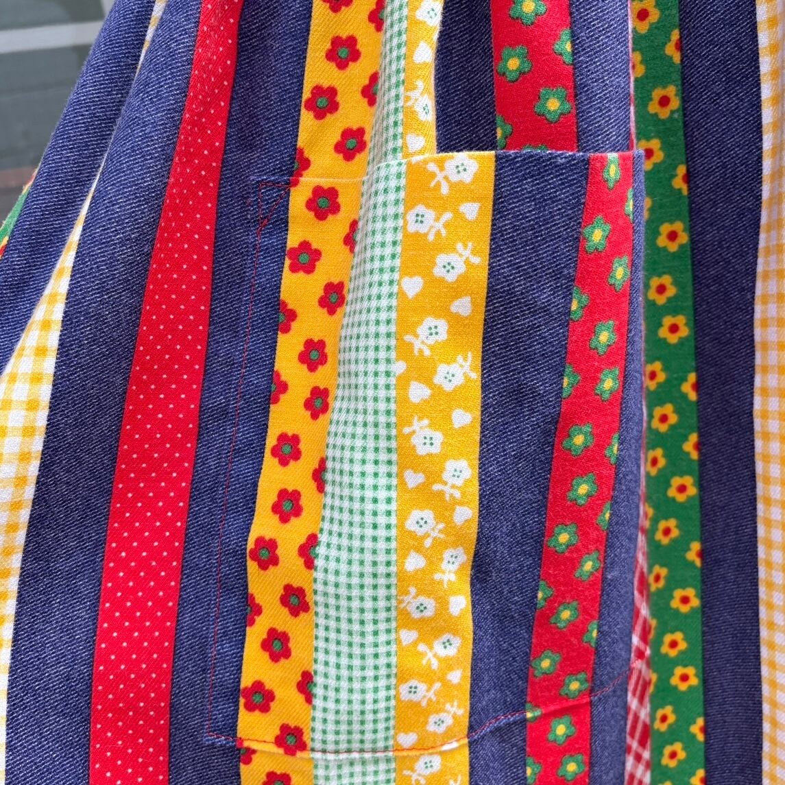 70年代 ヴィンテージ 当時のハンドメイド1点もの カラフルパッチワークプリント エプロンドレスです。