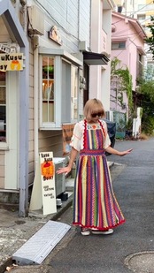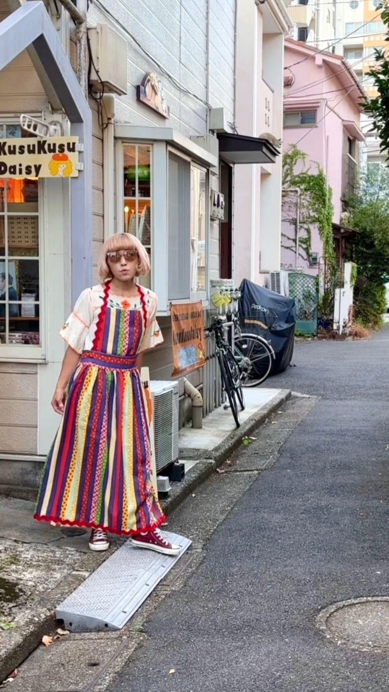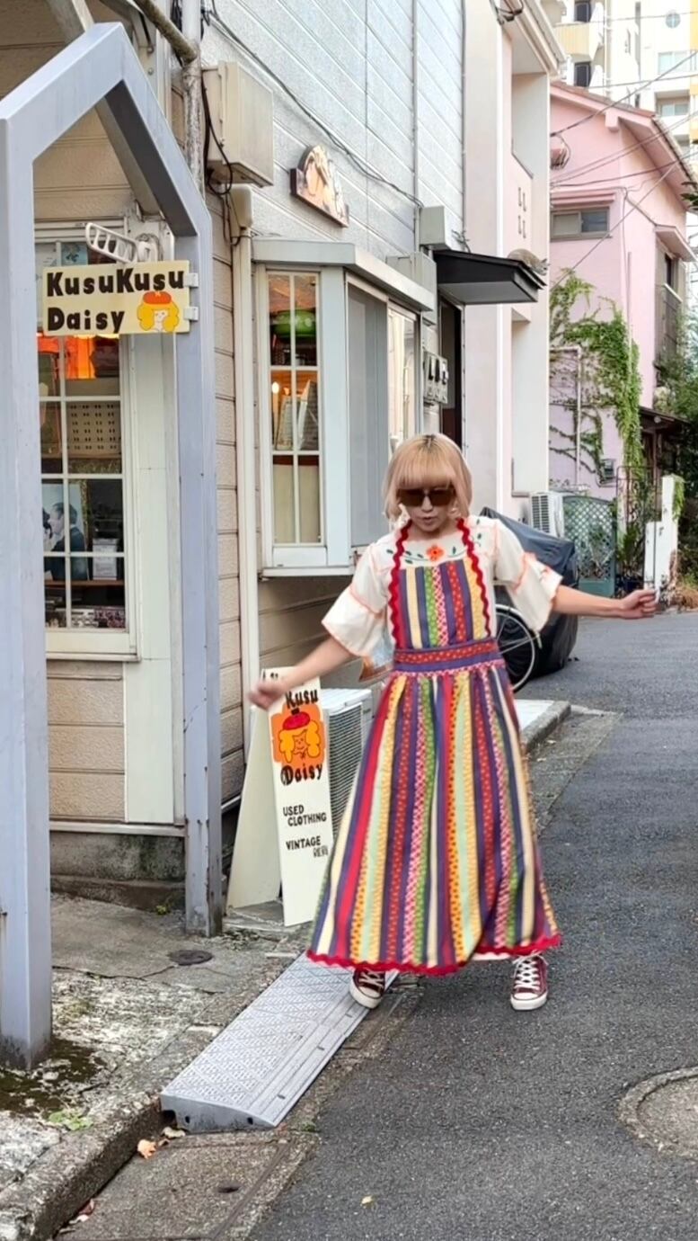 裾や胸当ての両サイドから首元につながった幅のあるなみなみの紐も可愛いポイントです。