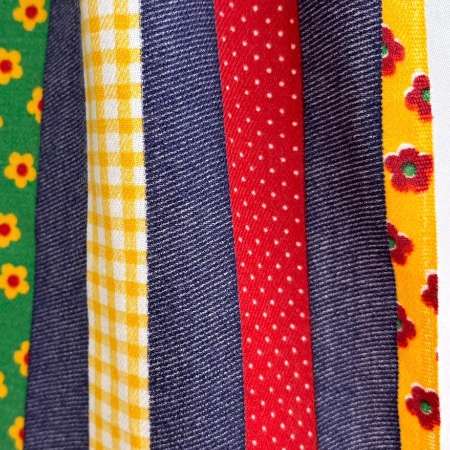 3パターンのポップなフラワー柄やギンガムチェックやピンドット模様、ハートとフラワー柄やチェック柄、デニムのカラフルなパッチワークプリントのストライプラインがとっても可愛いスペシャルな1着です。