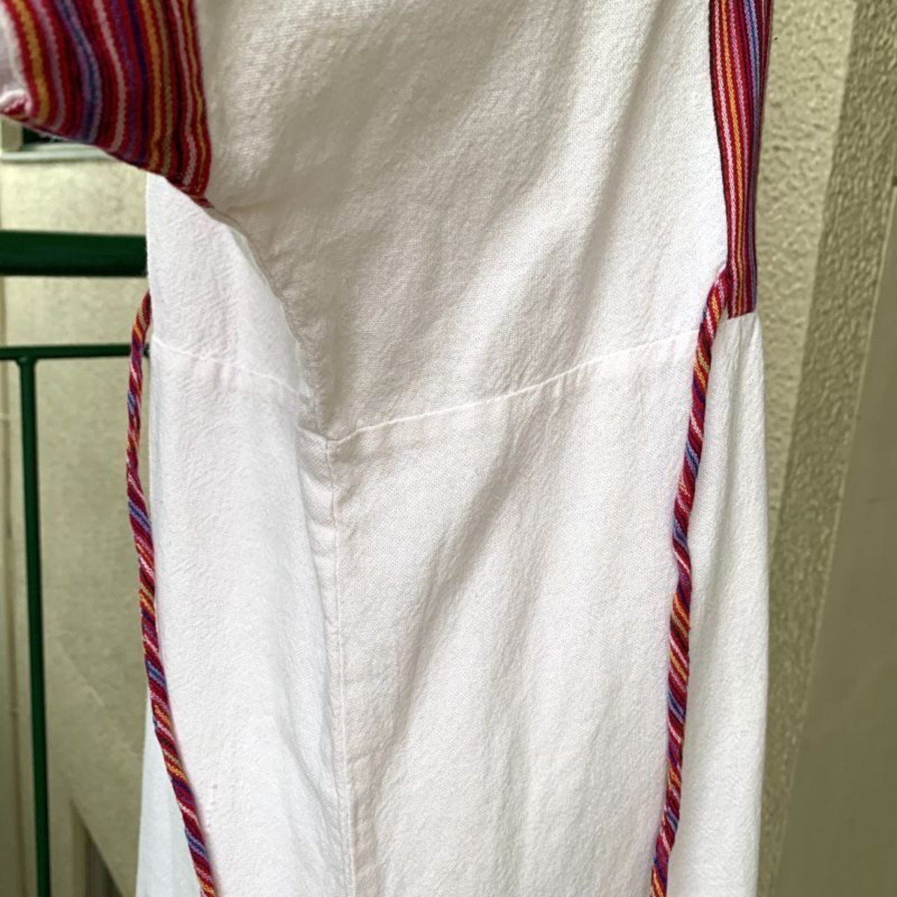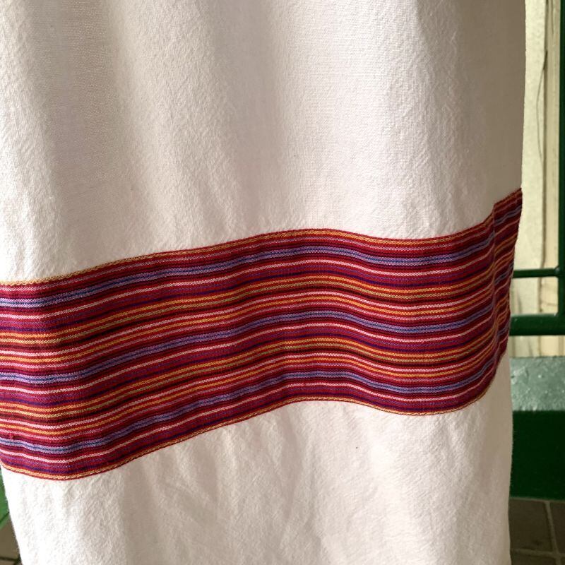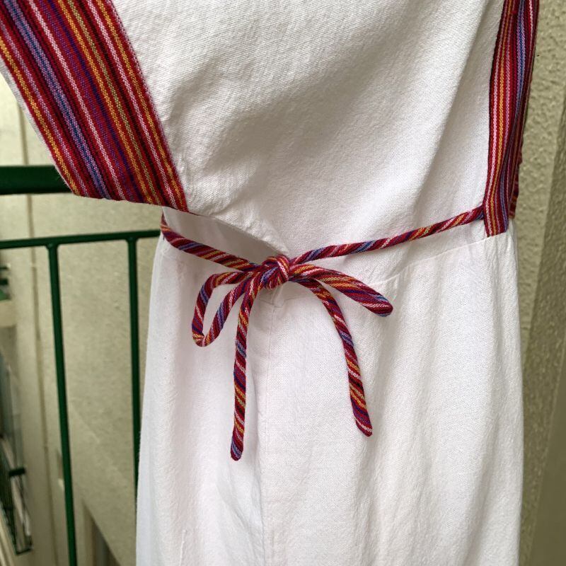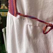 風合いのあるホワイトのコットン生地にマルチカラーの生地のライン、カードが6枚並んだようなカラフルな色使いの刺繍がとっても可愛い1着です。