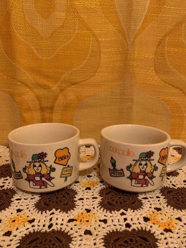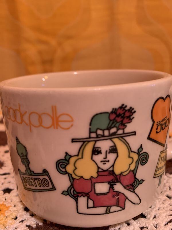 昭和レトロ DEADSTOCK 未使用 ニュータイプクック LadyMugです。厚みがあり安定感のあるフォルムにお花飾りのグリーンのHATにブロンドヘアーのLadyがお茶を嗜む絵柄がレトロでとっても可愛いです。絵柄のカラーリングも昭和ならではの可愛いさです。反対面のネコや犬の表情も何とも言えない可愛い雰囲気があります。若干の経年感はありますが気になるような大きなダメージはありません。各お一つずつの販売となります。