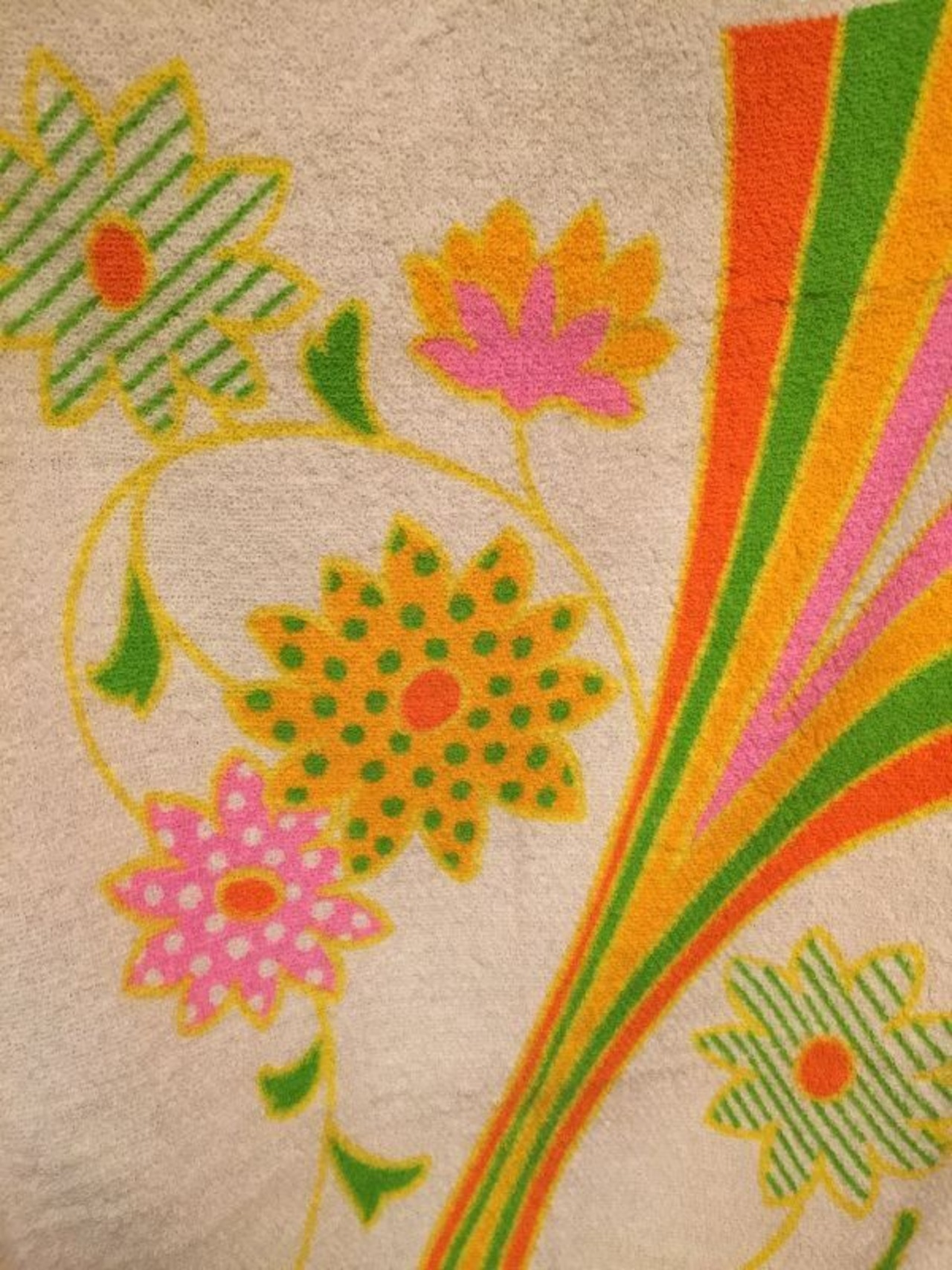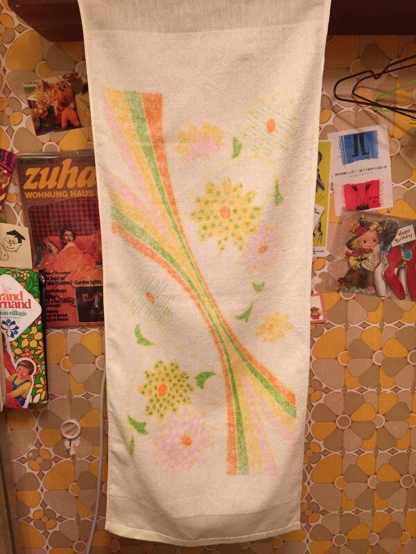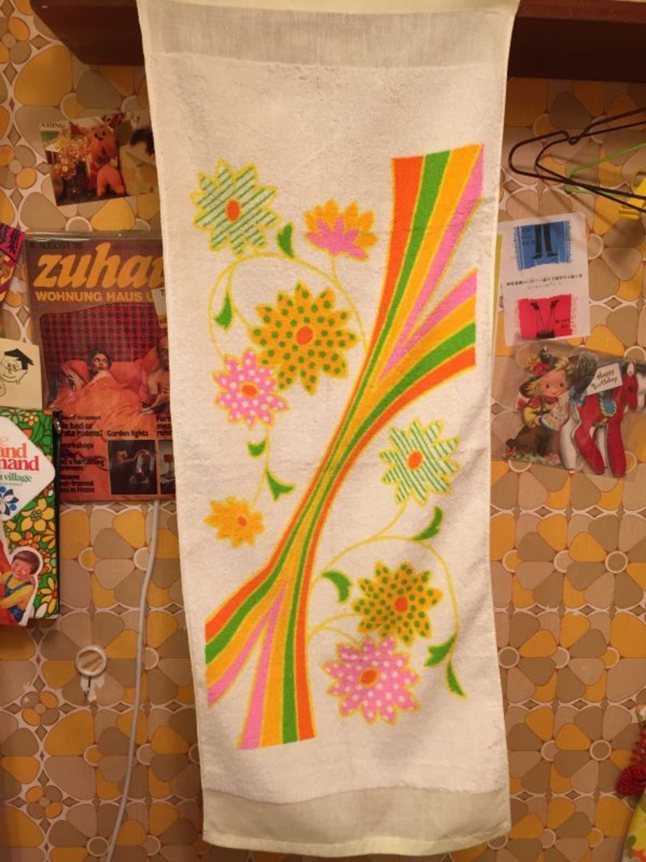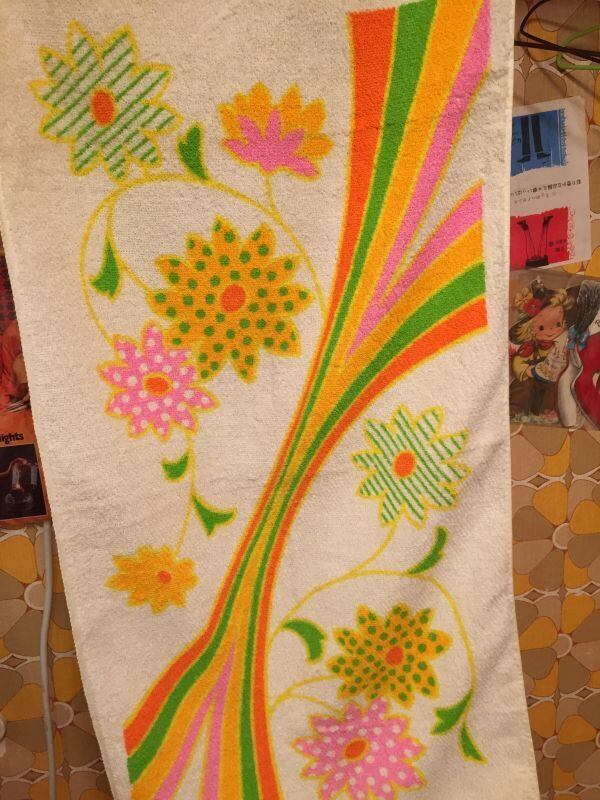 昭和レトロ DEADSTOCK未使用のフェイスタオルです。明るめな色使い、ドットやストライプのお花模様がポップで可愛いですね。薄めの生地感が昭和の雰囲気です。経年による糸のよれが若干あります。