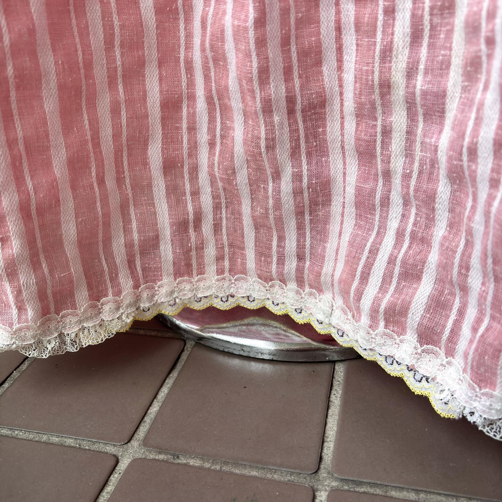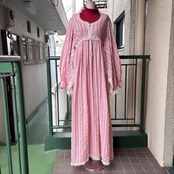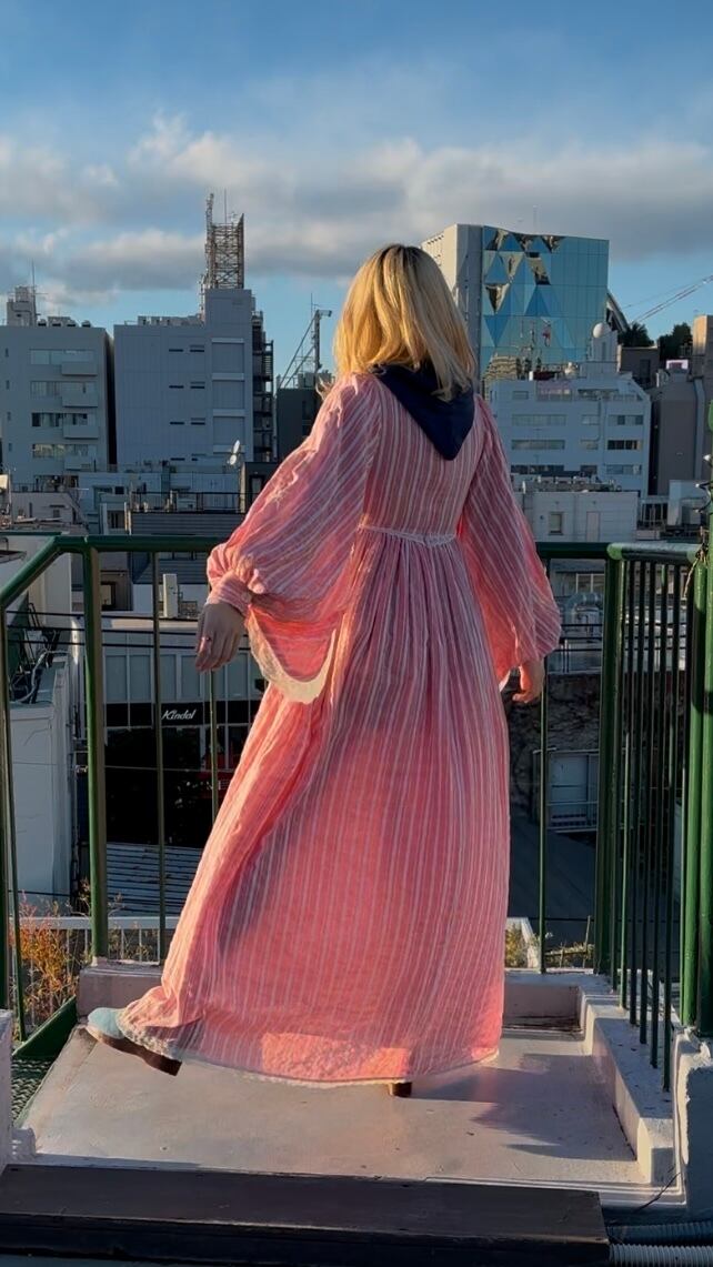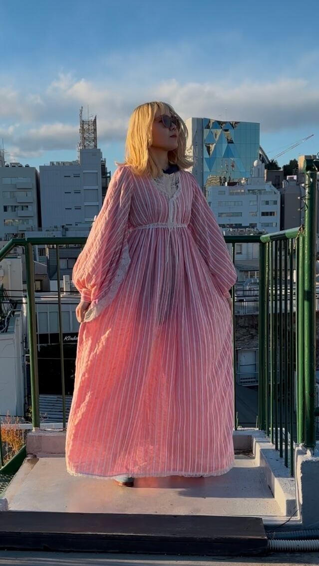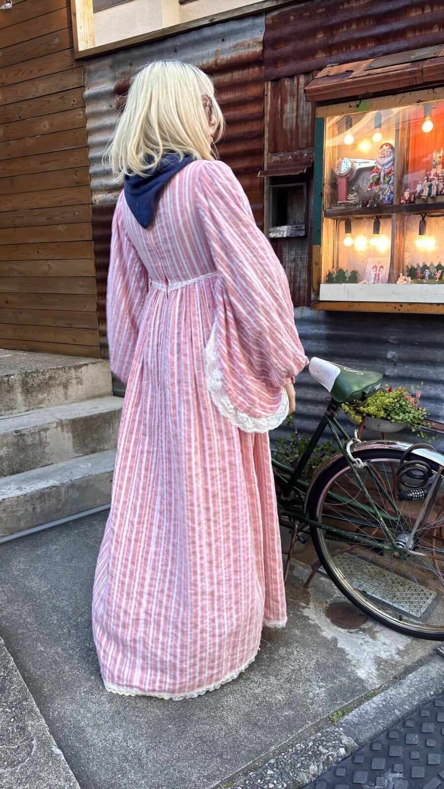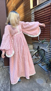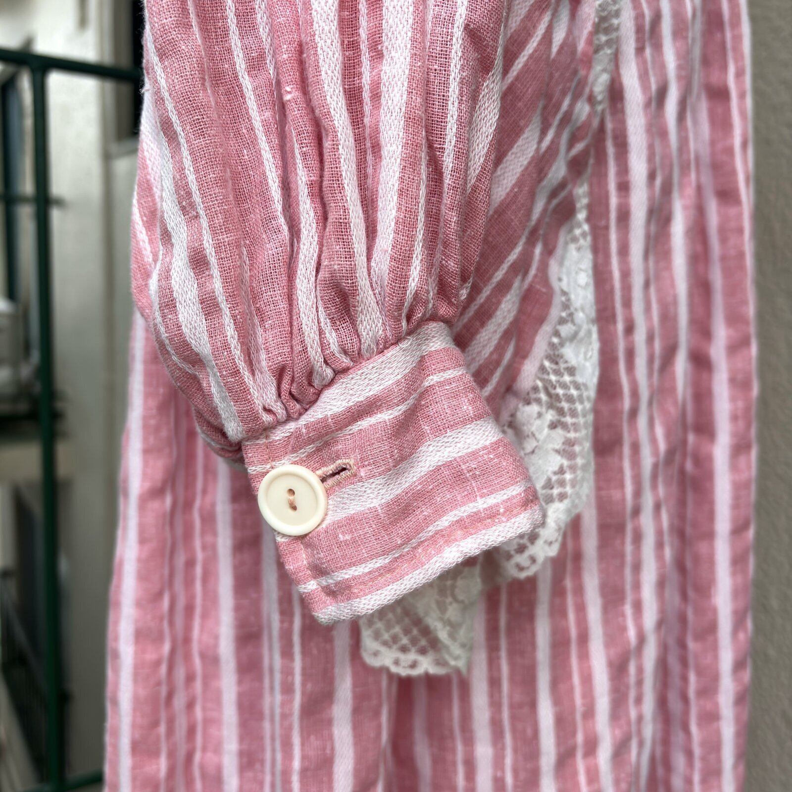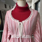 ライトなストロベリーピンクとホワイトのマルチストライプや織りの入った風合いのあるライトな生地感、ボリュームのあるバルーンスリーブがとっても可愛い1着です。