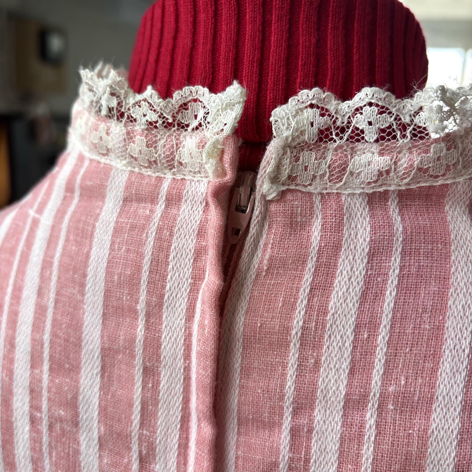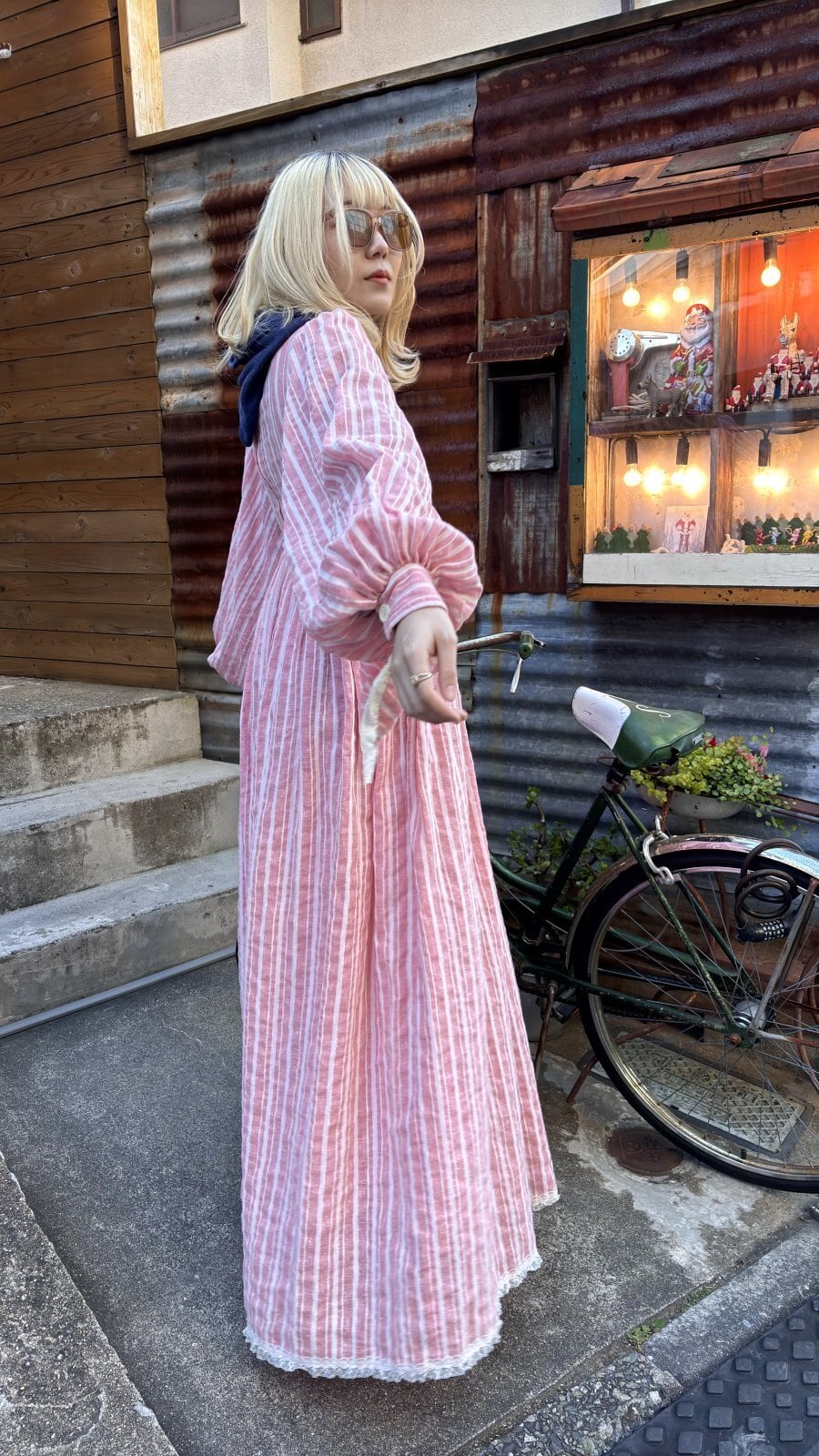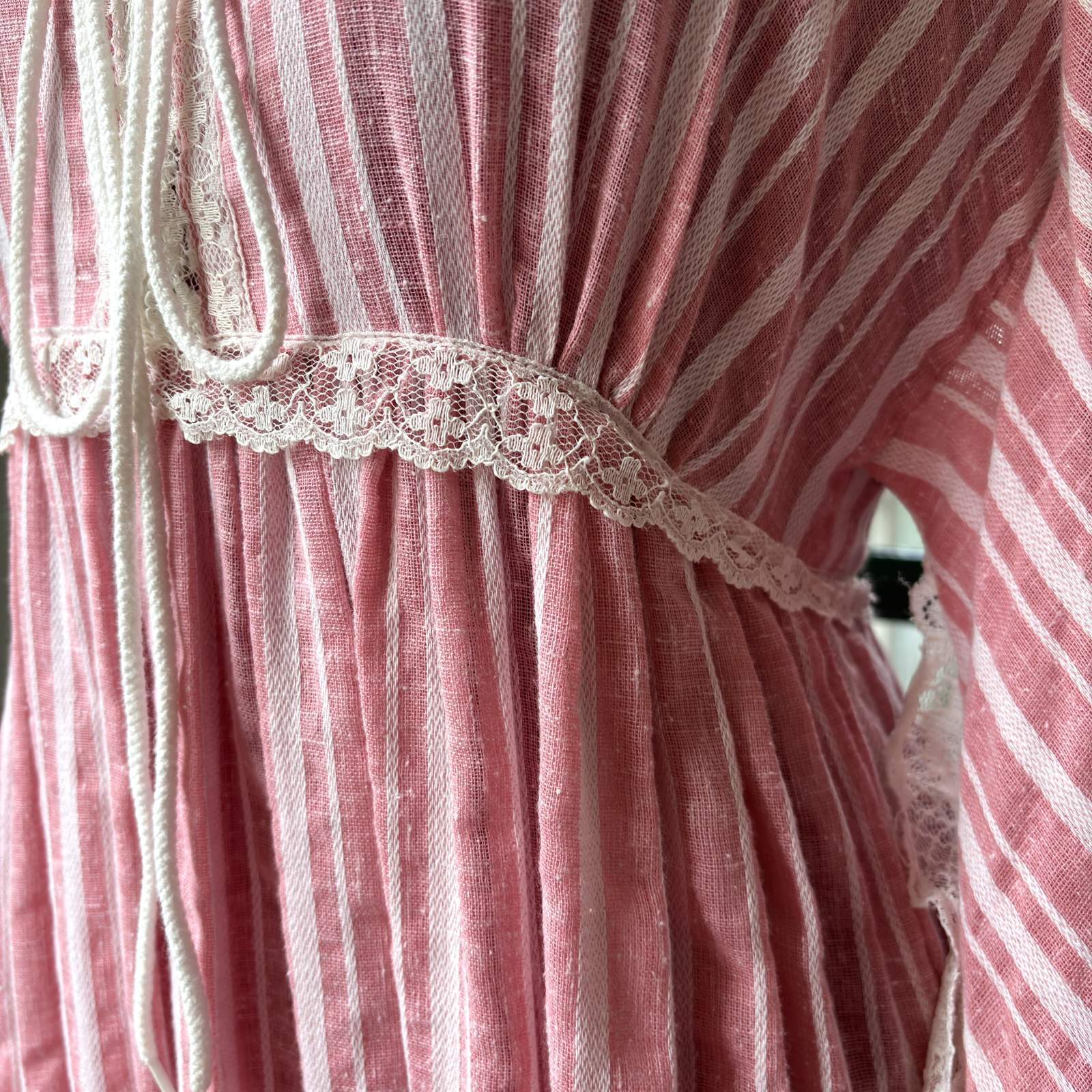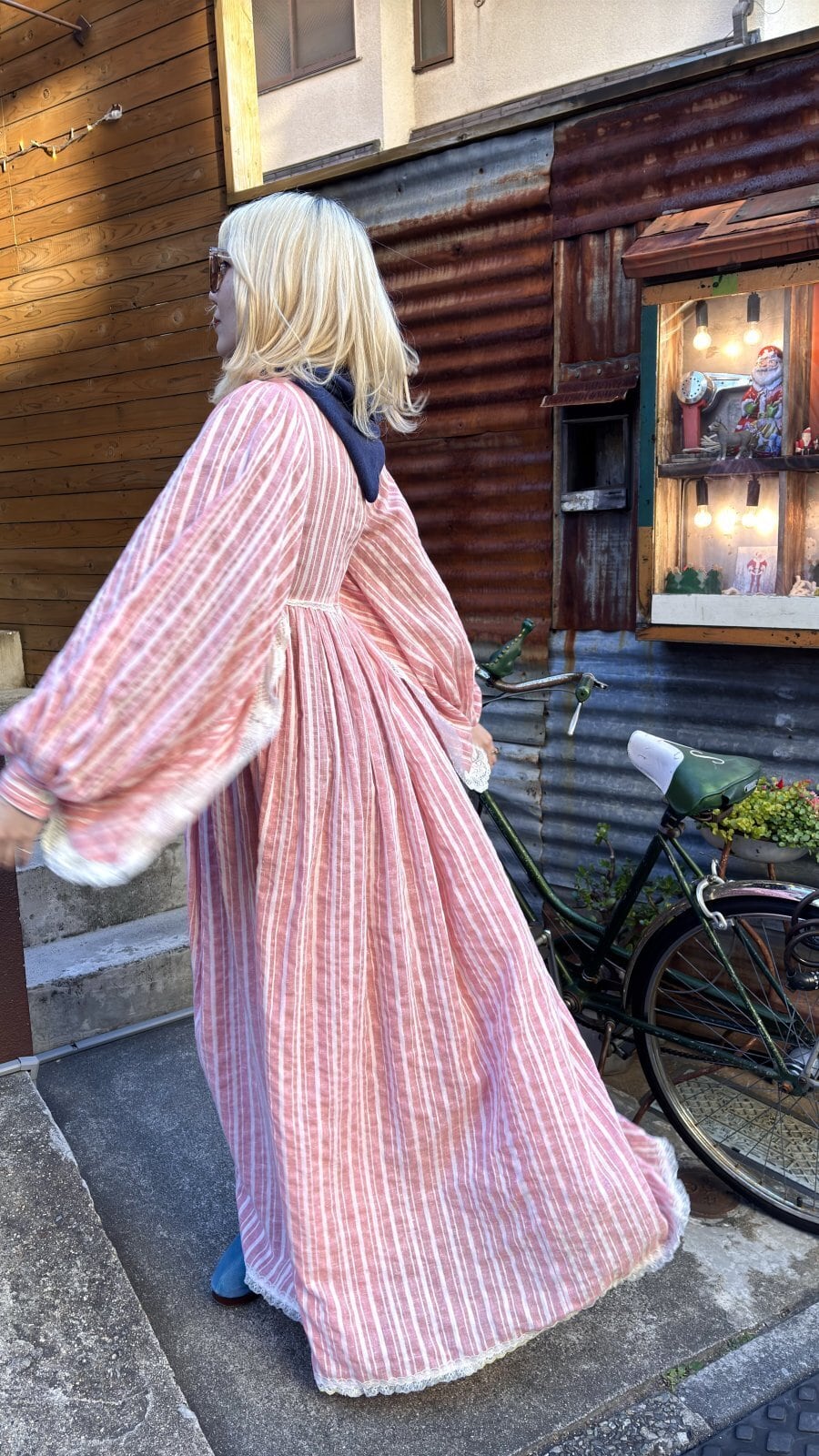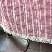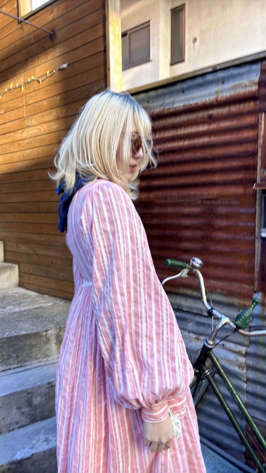 ライトなストロベリーピンクとホワイトのマルチストライプや織りの入った風合いのあるライトな生地感、ボリュームのあるバルーンスリーブがとっても可愛い1着です。