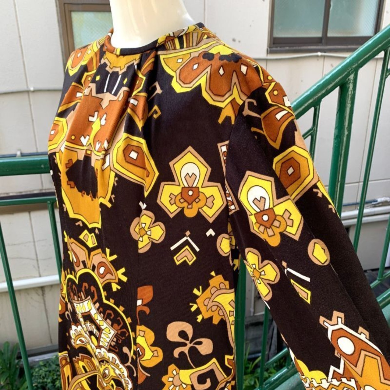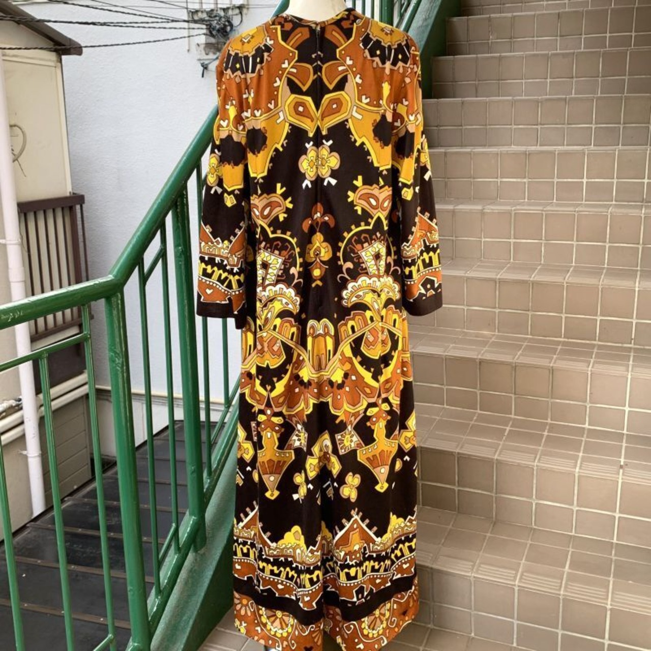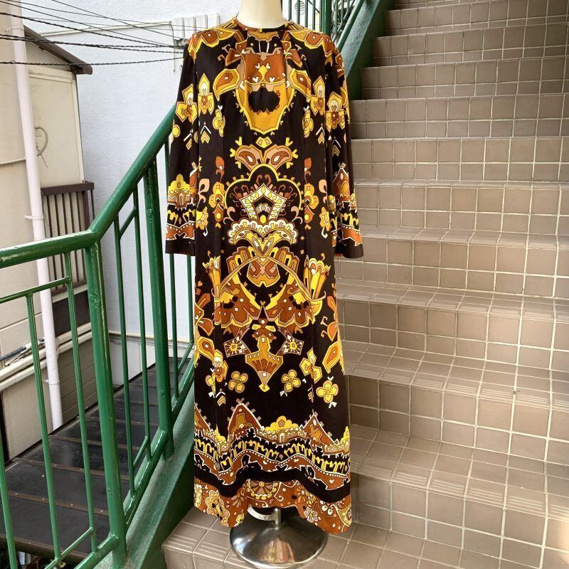 70'S USA Vintage oriental flower pattern poly long dress。